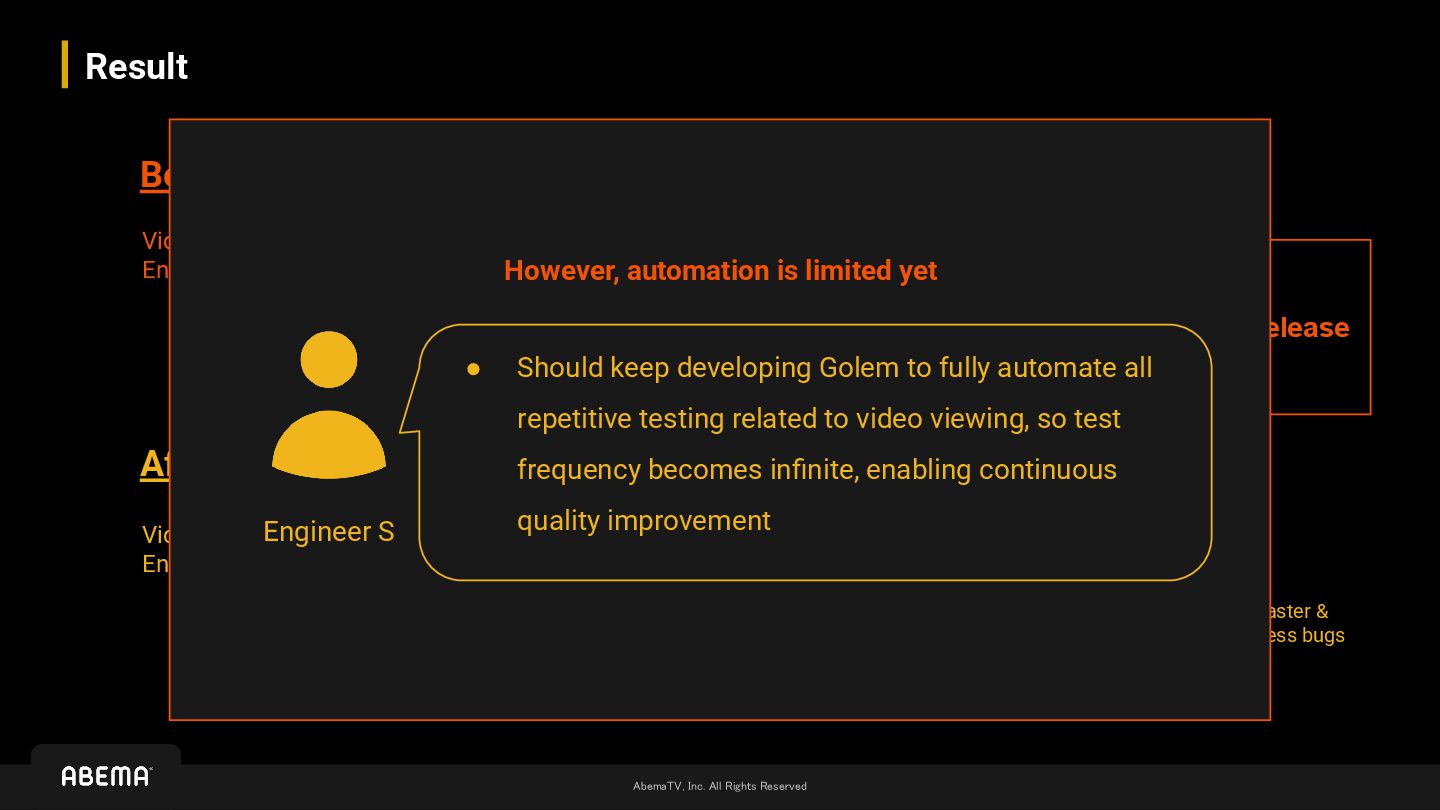 Navigation Development QA Develop Fix Develop Fix Test E2E Re-test Video Engineering Navigation Development QA Develop Develop Fix Test video feats Re-test Fix Test E2E Release Release Faster & Less bugs Engineer S • Should keep developing Golem to fully automate all repetitive testing related to video viewing, so test frequency becomes infinite, enabling continuous quality improvement However, automation is limited yet