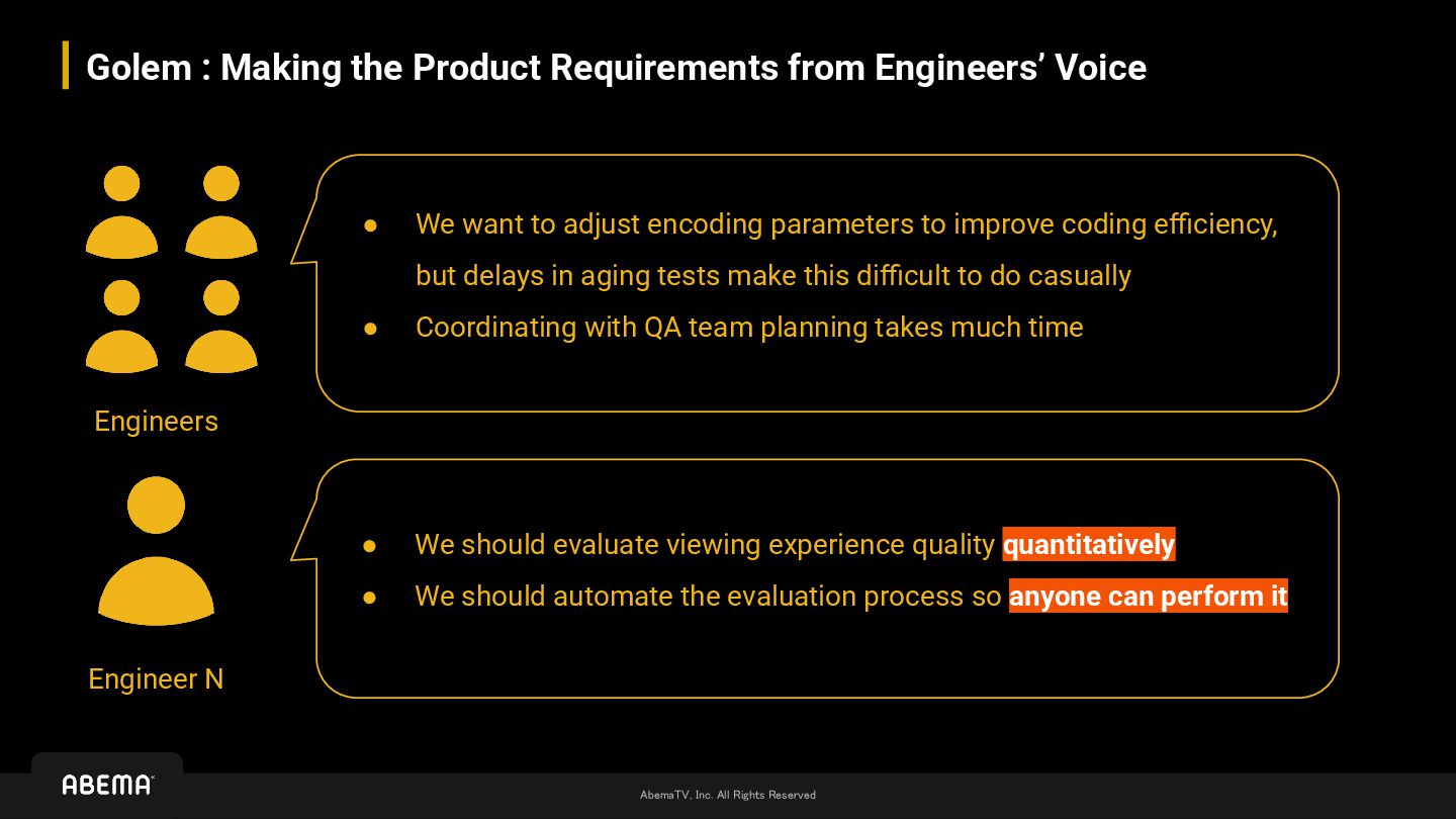 Requirements from Engineers’ Voice • We want to adjust encoding parameters to improve coding efficiency, but delays in aging tests make this difficult to do casually • Coordinating with QA team planning takes much time Engineer N • We should evaluate viewing experience quality quantitatively • We should automate the evaluation process so anyone can perform it Engineers