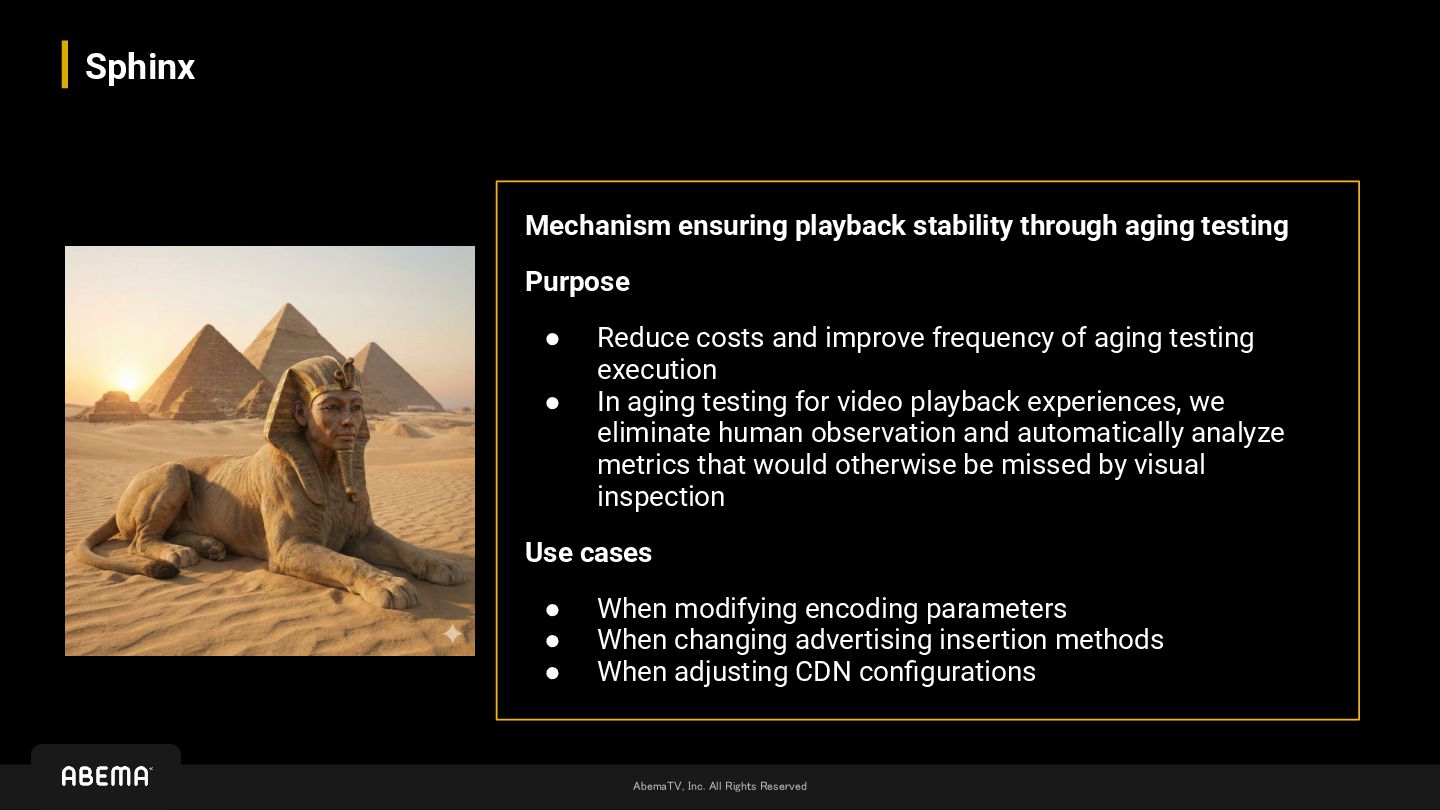 through aging testing Purpose • Reduce costs and improve frequency of aging testing execution • In aging testing for video playback experiences, we eliminate human observation and automatically analyze metrics that would otherwise be missed by visual inspection Use cases • When modifying encoding parameters • When changing advertising insertion methods • When adjusting CDN configurations