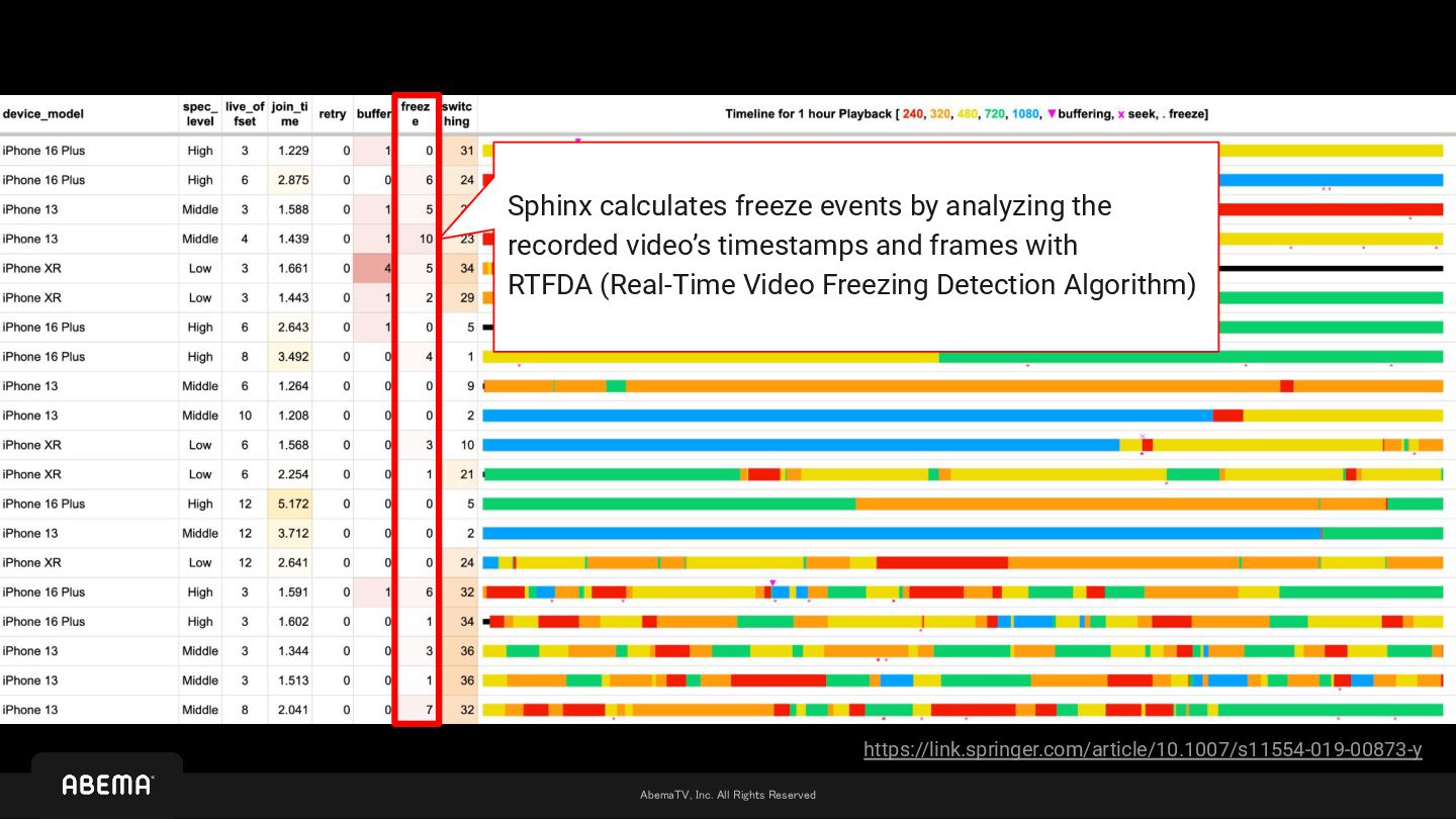 analyzing the recorded video’s timestamps and frames with RTFDA (Real-Time Video Freezing Detection Algorithm) https://link.springer.com/article/10.1007/s11554-019-00873-y