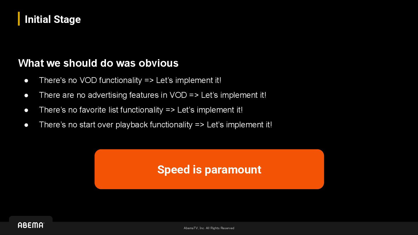 do was obvious • There's no VOD functionality => Let’s implement it! • There are no advertising features in VOD => Let’s implement it! • There’s no favorite list functionality => Let’s implement it! • There’s no start over playback functionality => Let’s implement it! Speed is paramount