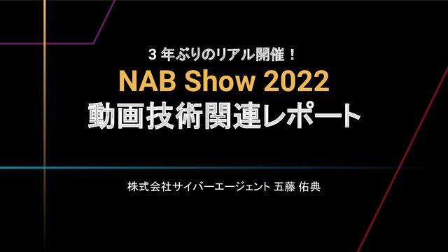 日 NAB Show 2019 開催 • 2020 年: NAB Show 2020 キャンセル • 2021 年: 10 月 NAB Show 2021 の開催を試みたが、延期 • 2022 年: 4 月 NAB Show 2022 開催 ← ココ コロナ禍の開催は厳しく 3 年ぶりに開催