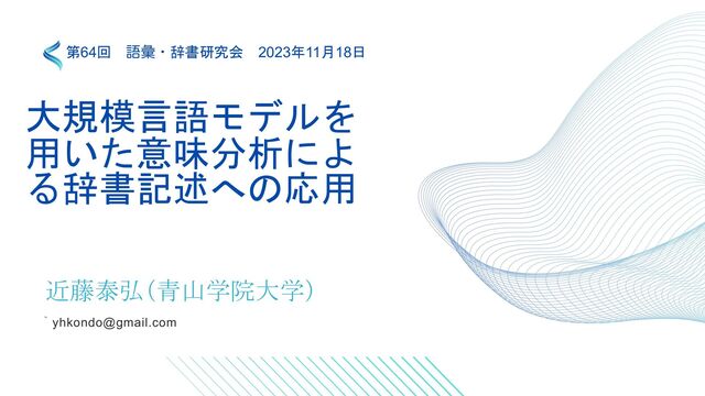 大規模言語モデルを 用いた意味分析によ る辞書記述への応用 近藤泰弘(青山学院大学) 第64回 ޠኮɾ辞書研究会 2023年11月18日 `