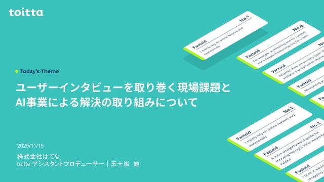 ユーザーインタビューを取り巻く現場課題と AI事業による解決の取り組みについて 株式会社はてな toitta アシスタントプロデューサー|五十嵐 雄 Today’s Theme 2025/11/15