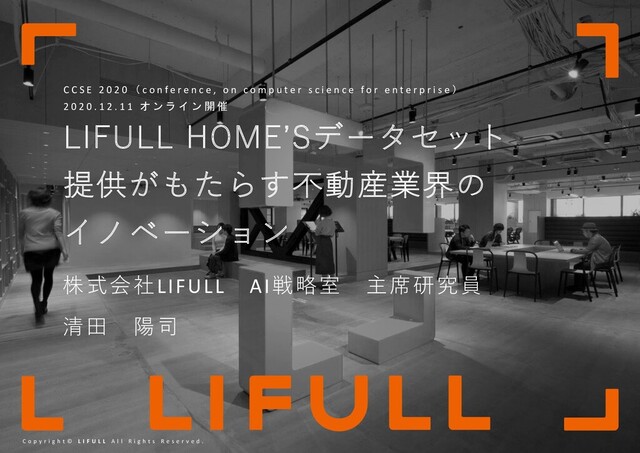 LIFULL HOMEʼSデータセット 提供がもたらす不動産業界の イノベーション 株式会社LIFULL AI戦略室 主席研究員 清⽥ 陽司 C