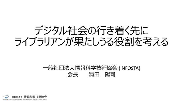 デジタル社会の⾏き着く先に ライブラリアンが果たしうる役割を考える ⼀般社団法⼈情報科学技術協会 (INFOSTA) 会⻑ 清⽥ 陽司