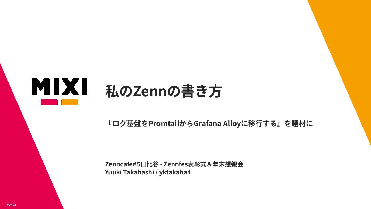©MIXI 私のZennの書き⽅ 『ログ基盤をPromtailからGrafana Alloyに移⾏する』を題材に Zenncafe#5⽇⽐⾕ - Zennfes表彰式&年末懇親会 Yuuki Takahashi /