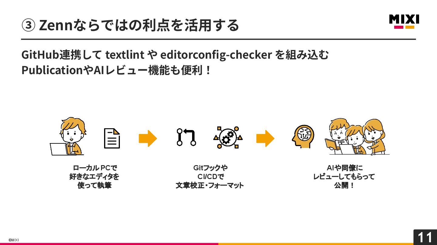 11 ©MIXI ③ Zennならではの利点を活⽤する GitHub連携して textlint や editorconfig-checker を組み込む PublicationやAIレビュー機能も便利!