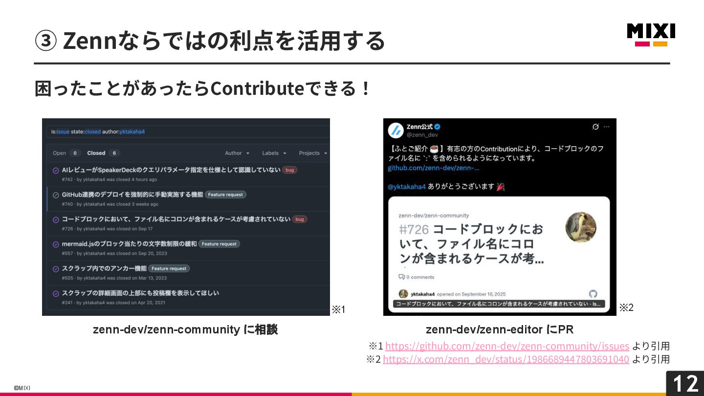 12 ©MIXI ③ Zennならではの利点を活⽤する 困ったことがあったらContributeできる! zenn-dev/zenn-community に相談 ※1 https://github.com/zenn-dev/zenn-community/issues より引⽤