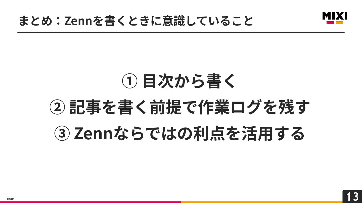 13 ©MIXI ① ⽬次から書く ② 記事を書く前提で作業ログを残す ③ Zennならではの利点を活⽤する まとめ:Zennを書くときに意識していること
