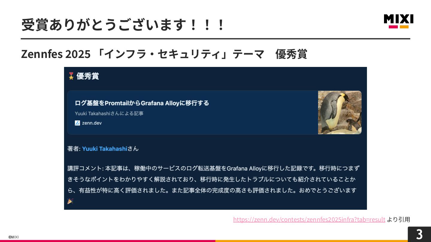 3 ©MIXI Zennfes 2025 「インフラ‧セキュリティ」テーマ 優秀賞 受賞ありがとうございます!!! https://zenn.dev/contests/zennfes2025infra?tab=result より引⽤