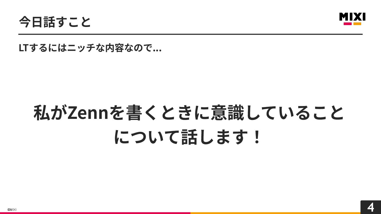 4 ©MIXI 私がZennを書くときに意識していること について話します! LTするにはニッチな内容なので... 今⽇話すこと