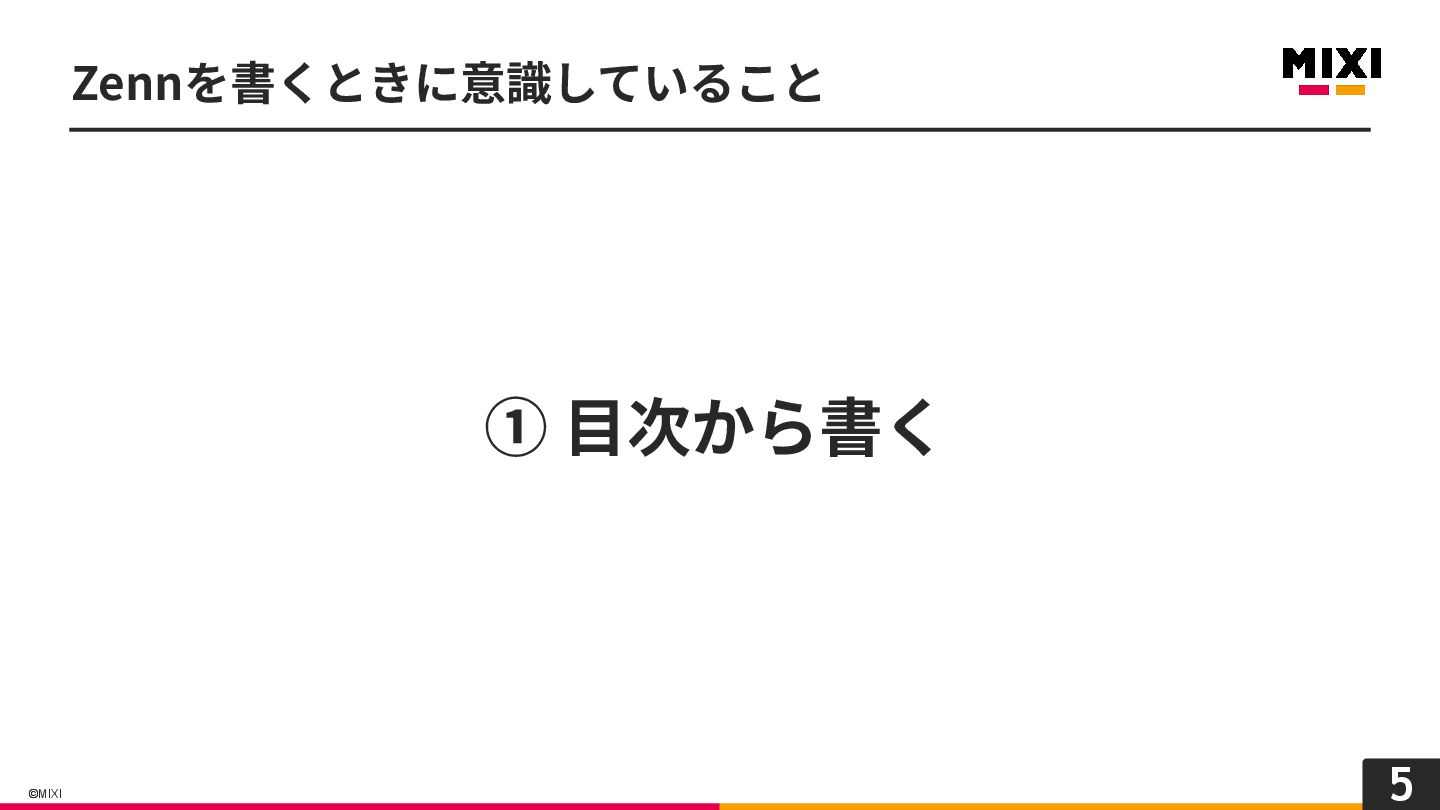 5 ©MIXI ① ⽬次から書く Zennを書くときに意識していること