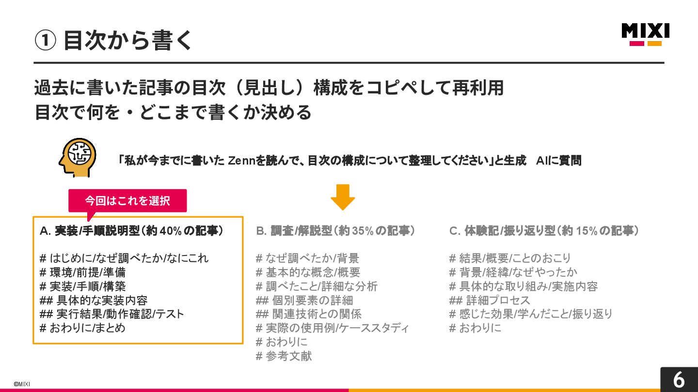 6 ©MIXI 過去に書いた記事の⽬次(⾒出し)構成をコピペして再利⽤ ⽬次で何を‧どこまで書くか決める ① ⽬次から書く A. 実装/手順説明型(約 40%の記事) #