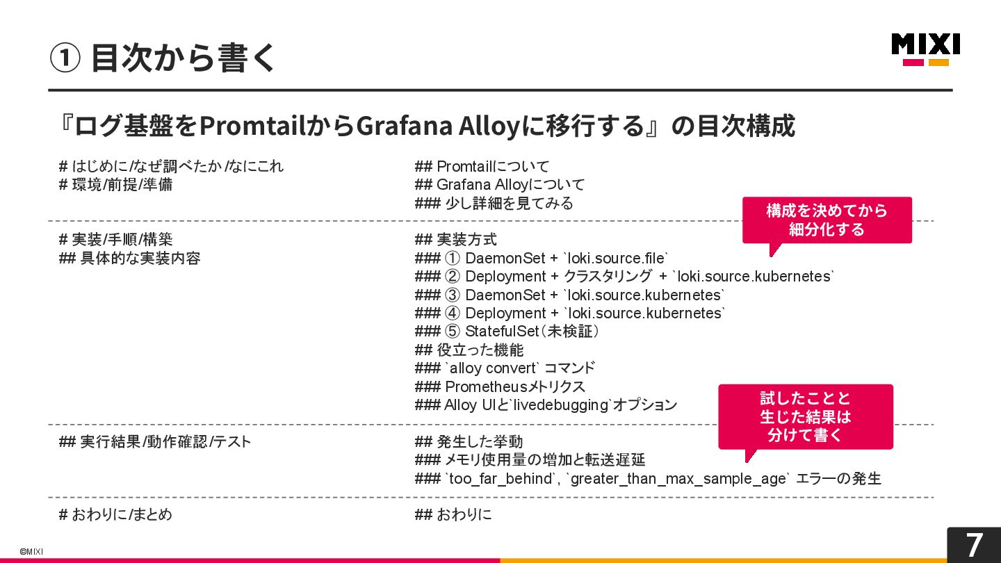 7 ©MIXI ① ⽬次から書く # はじめに/なぜ調べたか/なにこれ # 環境/前提/準備 # 実装/手順/構築