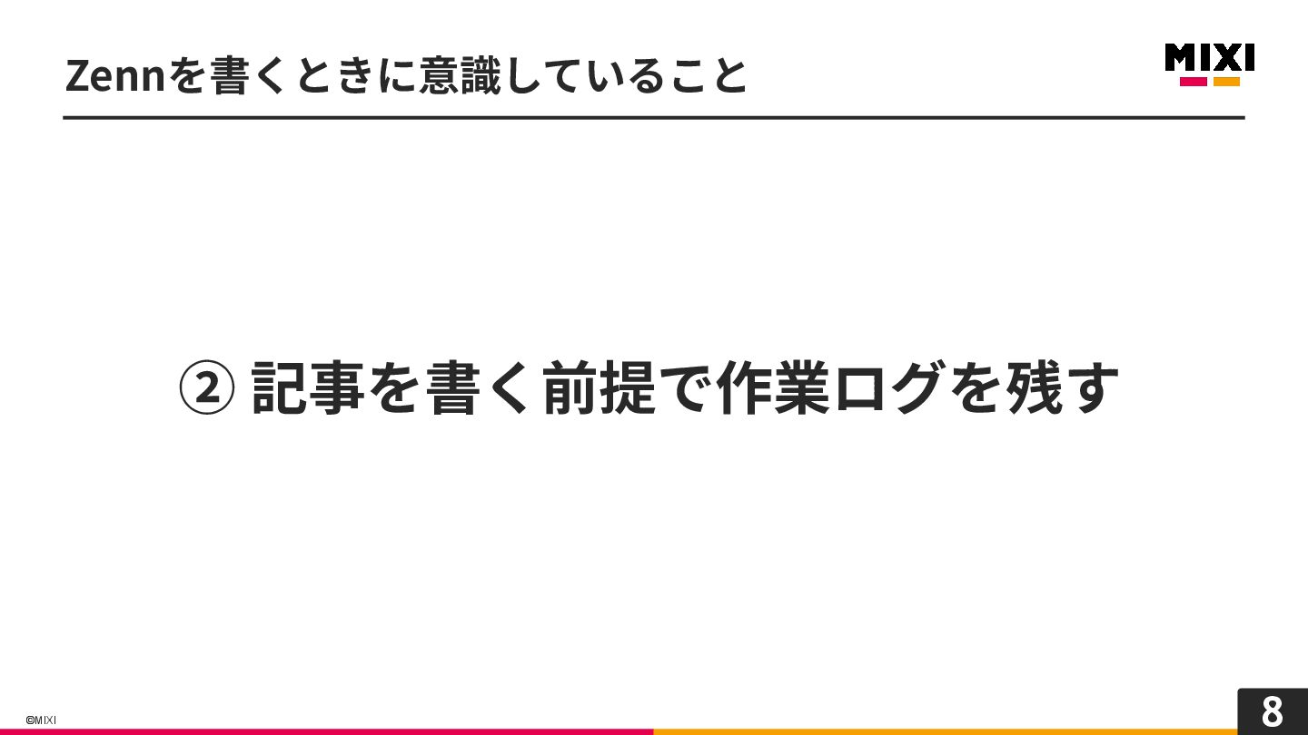 8 ©MIXI ② 記事を書く前提で作業ログを残す Zennを書くときに意識していること