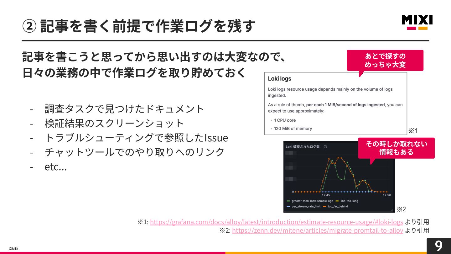 https://zenn.dev/mitene/articles/migrate-promtail-to-alloy より引⽤ ※1 ※2 - 調査タスクで⾒つけたドキュメント - 検証結果のスクリーンショット - トラブルシューティングで参照したIssue - チャットツールでのやり取りへのリンク - etc... あとで探すの めっちゃ⼤変 その時しか取れない 情報もある
