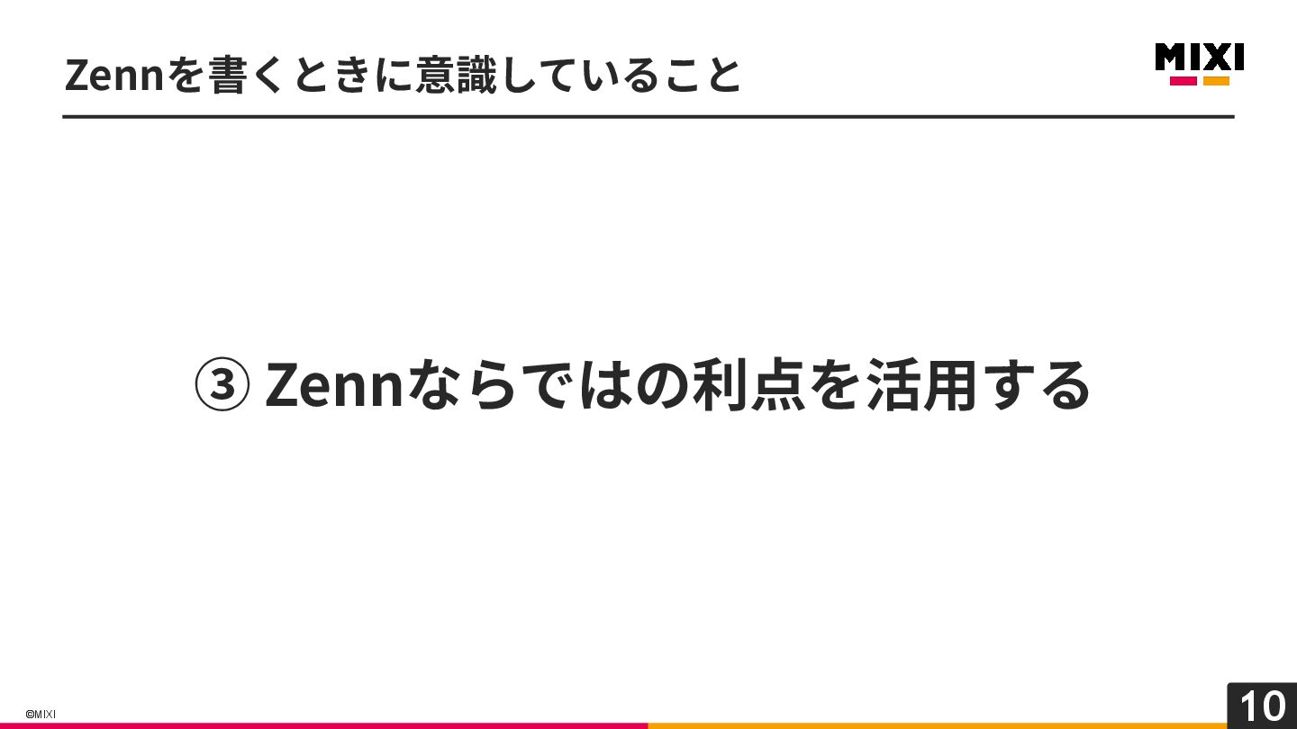 10 ©MIXI ③ Zennならではの利点を活⽤する Zennを書くときに意識していること