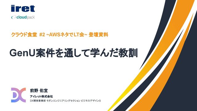 前野 佑宜 アイレット株式会社 DX開発事業部 モダンエンジニアリングセクション ビジネスデザインG GenU案件を通して学んだ教訓 クラウド食堂 #2 ~AWSネタでLT会~