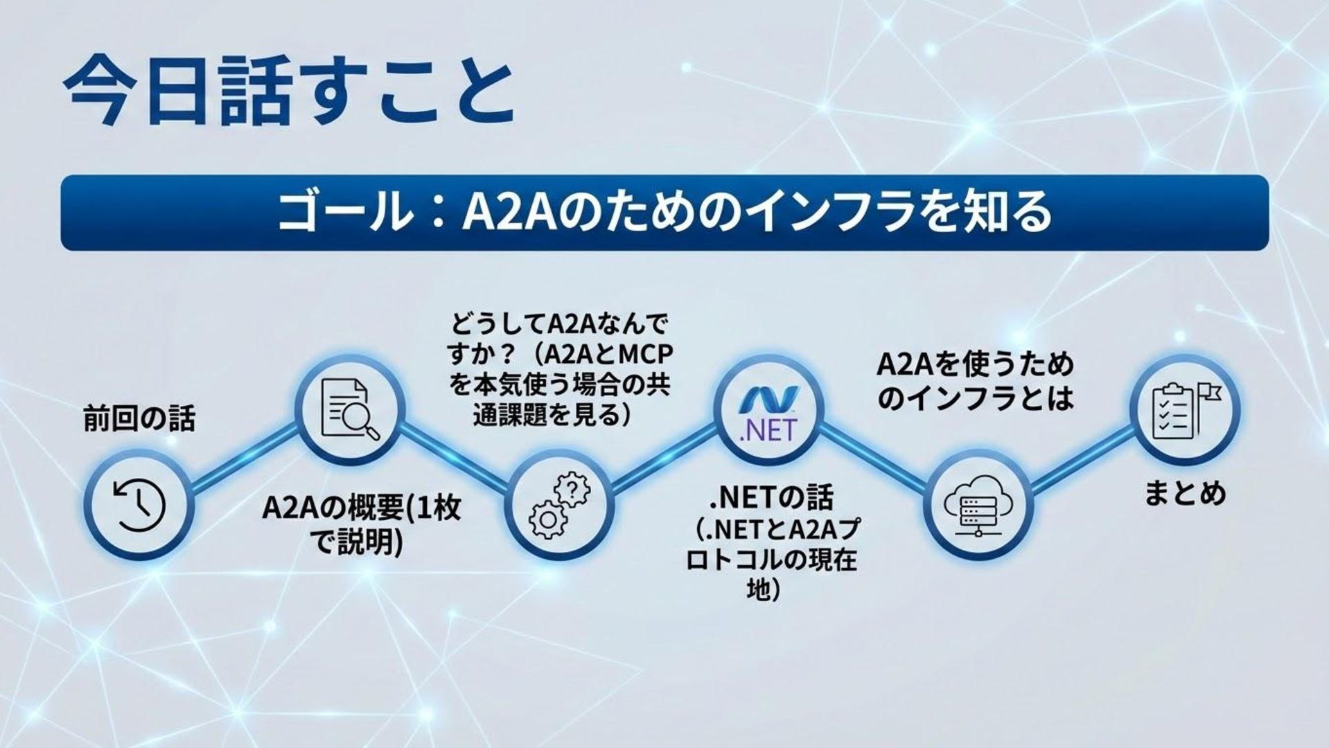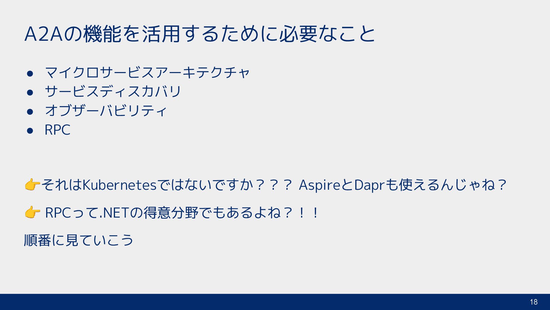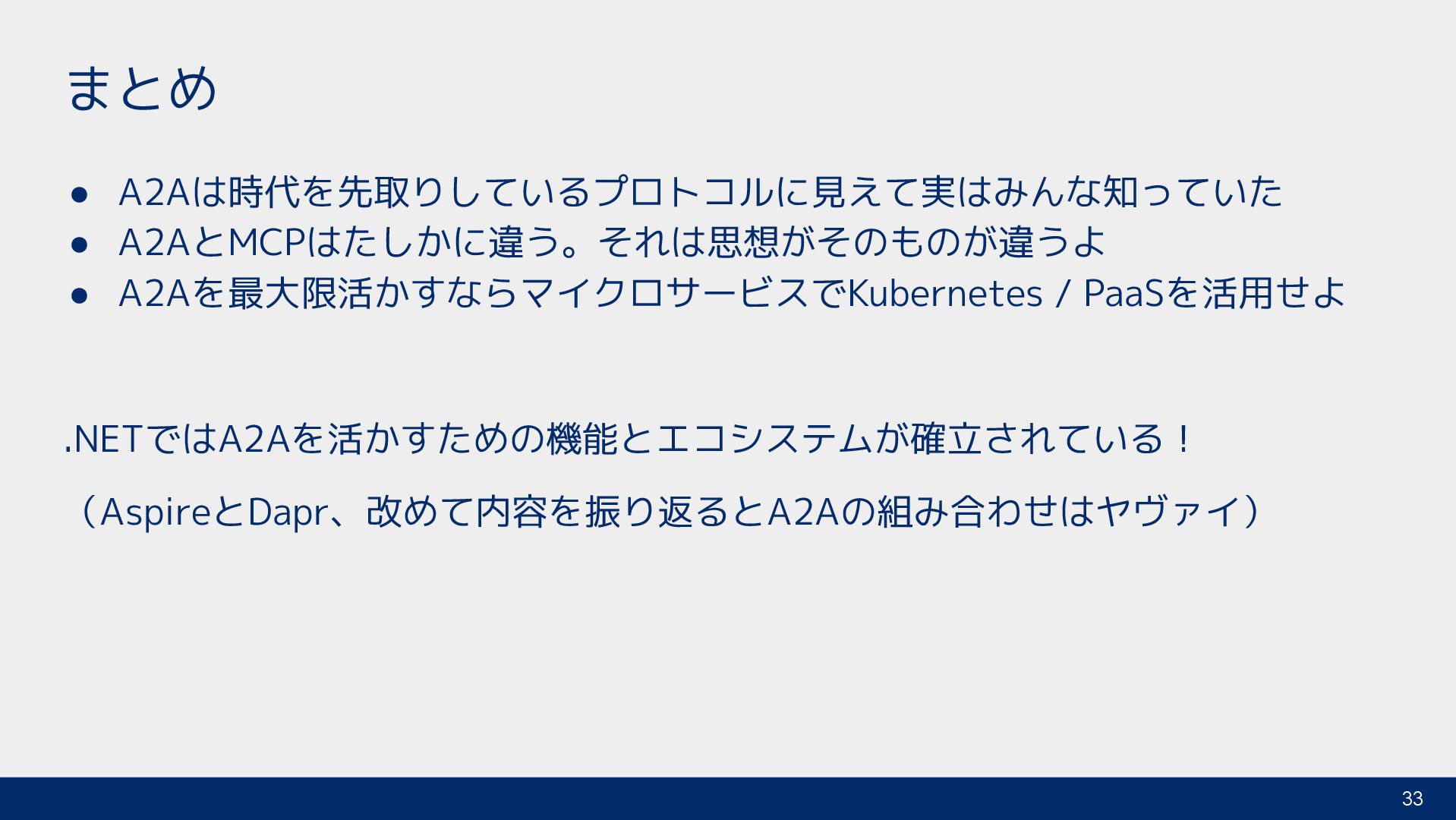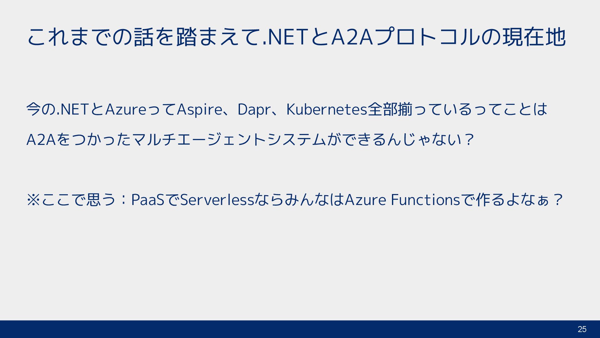 本資料では、AIエージェント間の連携を実現するA2Aプロトコルと、従来のMCPとの違いを説明します。A2Aはツール中心ではなく、ワークフロー中心の対話的なアプローチを提供し、大規模マルチエージェントシステムの課題に対応します。プロトコルの主な機能としてエージェントオーケストレーション、Discovery、JSON‑RPC over HTTP、タスク分解による専門性の分担、宣言的定義などがあります。また、Kubernetes と Azure の各 PaaS(App Service、Container Apps、Functions)を組み合わせることで、スケーラブルかつ観測可能なシステムを構築できることを示しています。.NET エコシステムは Aspire、Dapr、A2A SDK などを通じて必要な機能を備えており、マイクロサービスアーキテクチャ上で A2A を最大限活用できる環境が整っています。