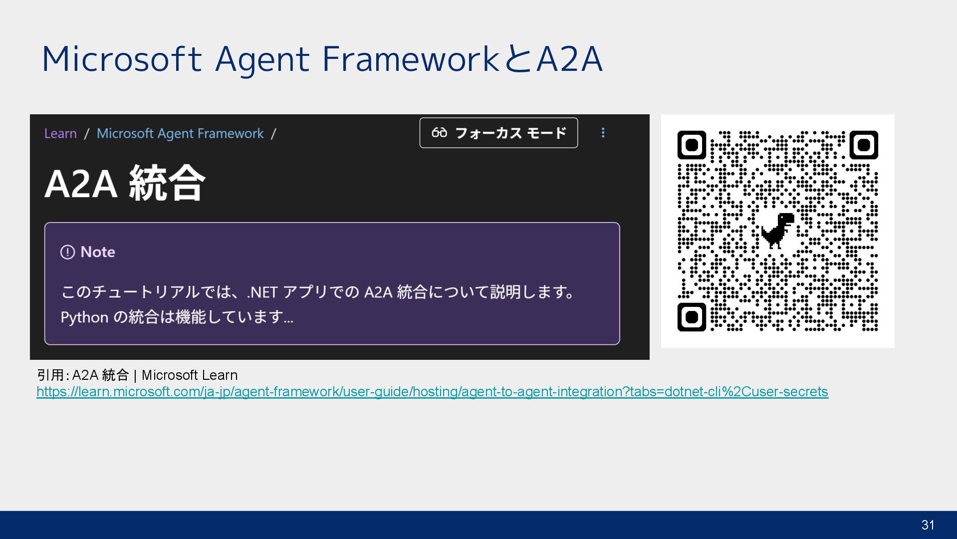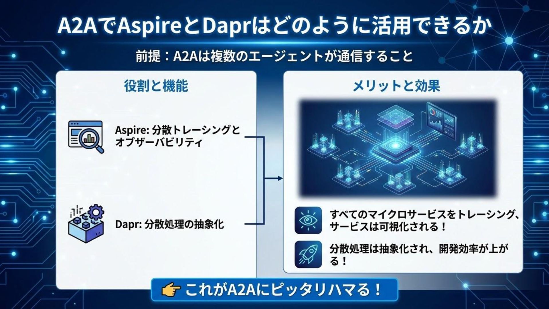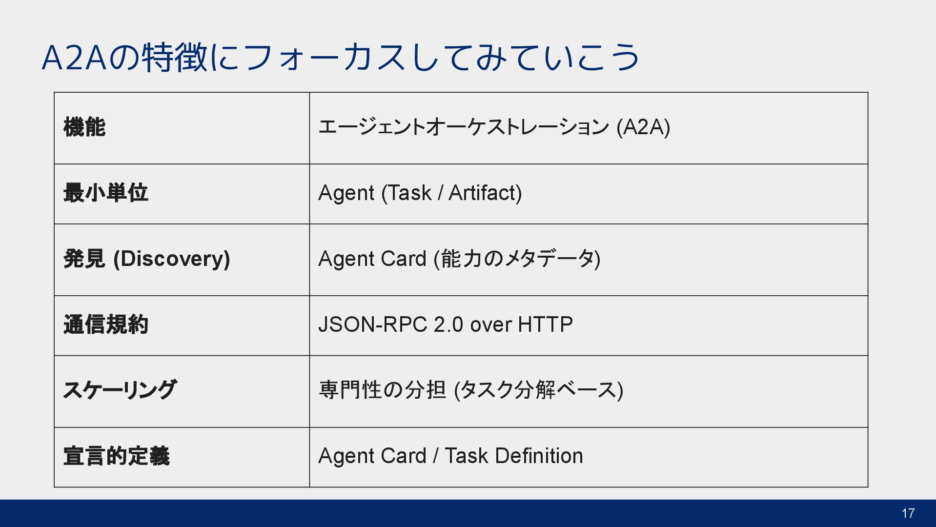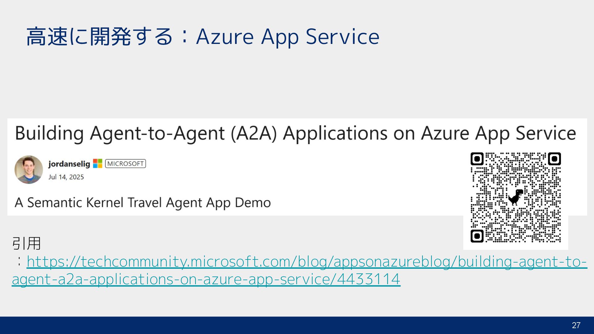 本資料では、AIエージェント間の連携を実現するA2Aプロトコルと、従来のMCPとの違いを説明します。A2Aはツール中心ではなく、ワークフロー中心の対話的なアプローチを提供し、大規模マルチエージェントシステムの課題に対応します。プロトコルの主な機能としてエージェントオーケストレーション、Discovery、JSON‑RPC over HTTP、タスク分解による専門性の分担、宣言的定義などがあります。また、Kubernetes と Azure の各 PaaS(App Service、Container Apps、Functions)を組み合わせることで、スケーラブルかつ観測可能なシステムを構築できることを示しています。.NET エコシステムは Aspire、Dapr、A2A SDK などを通じて必要な機能を備えており、マイクロサービスアーキテクチャ上で A2A を最大限活用できる環境が整っています。