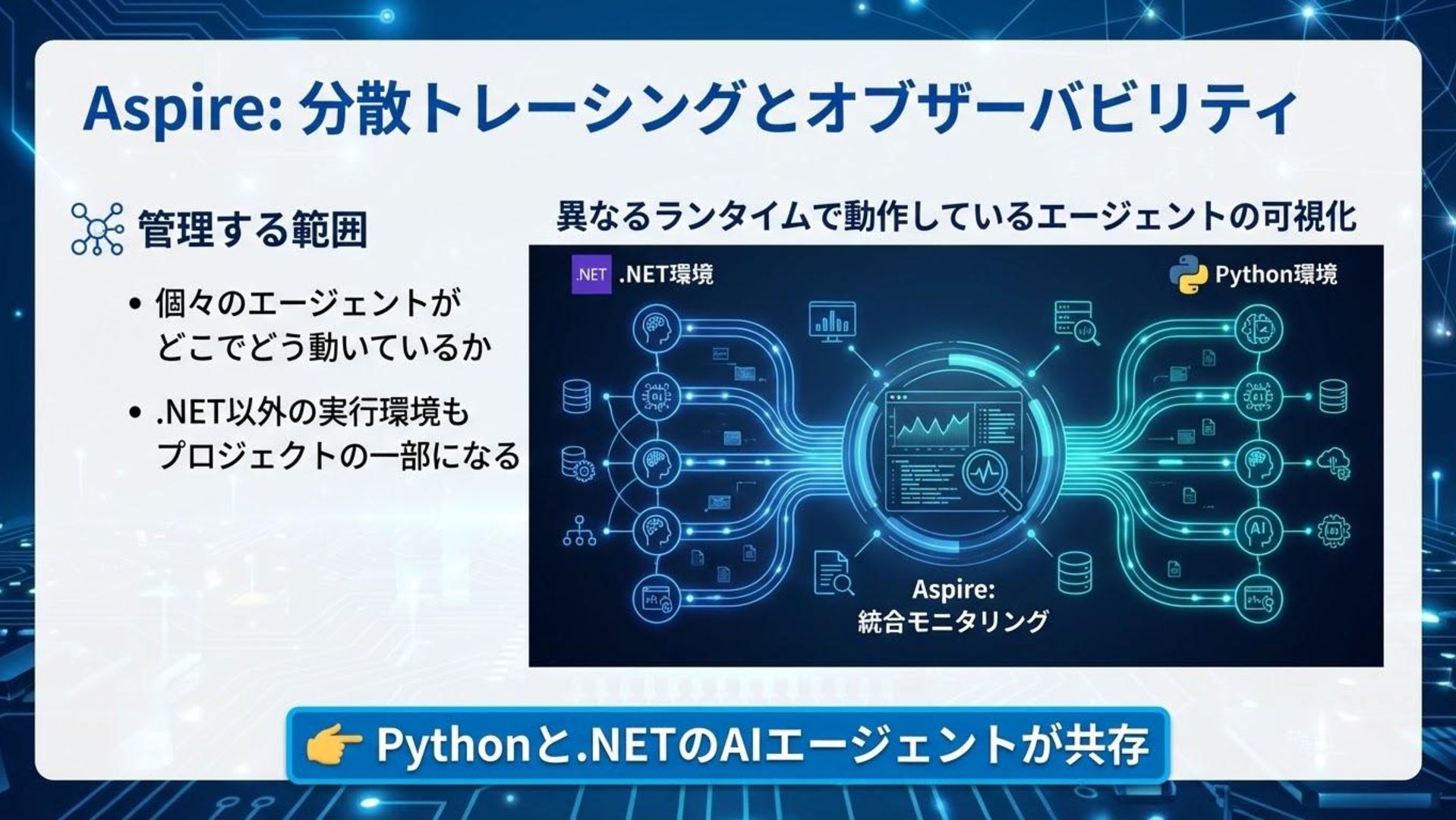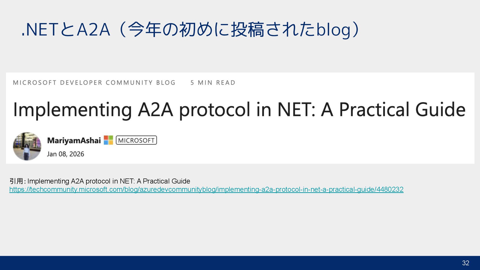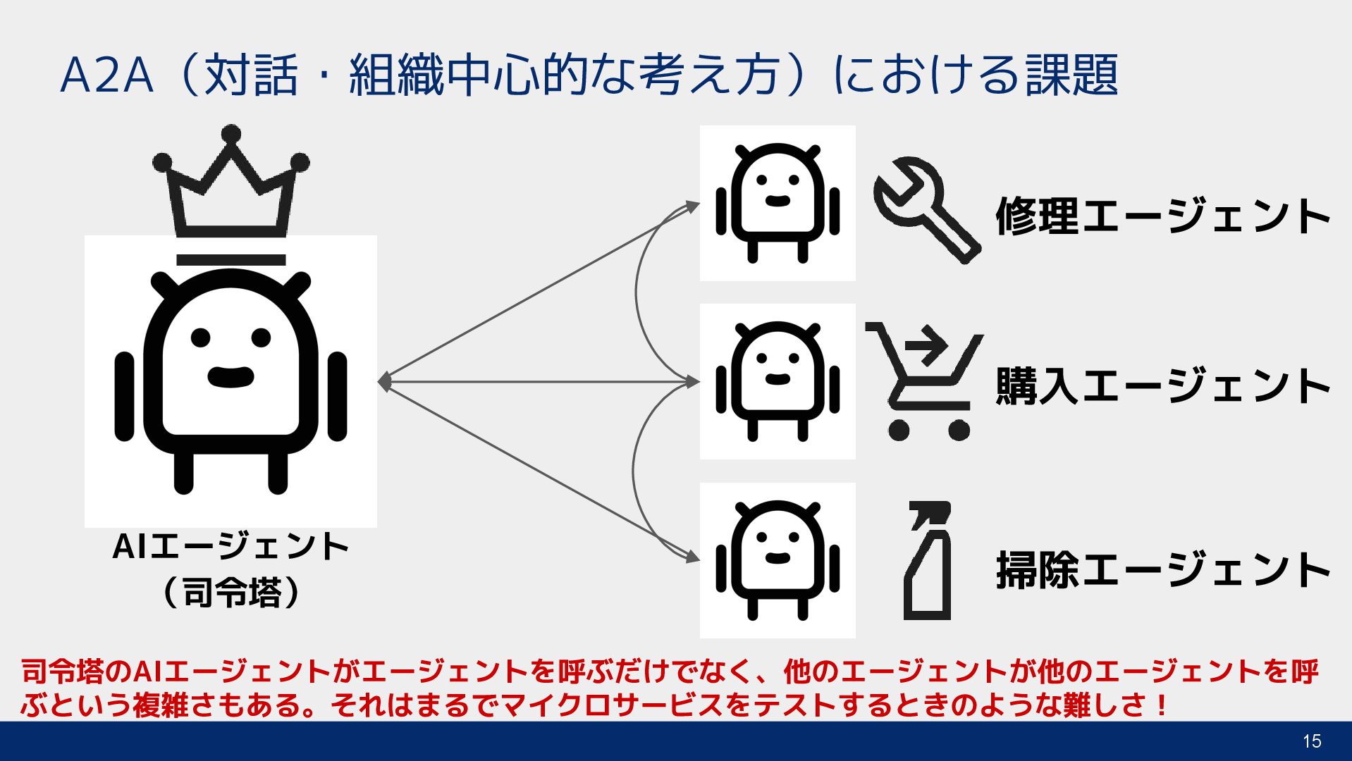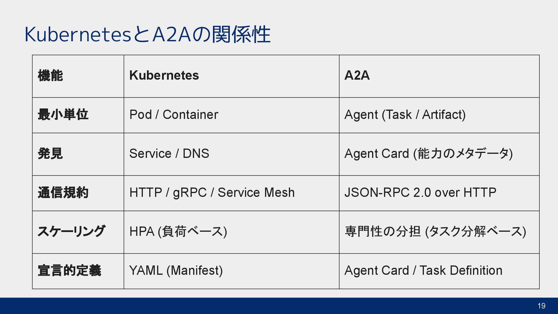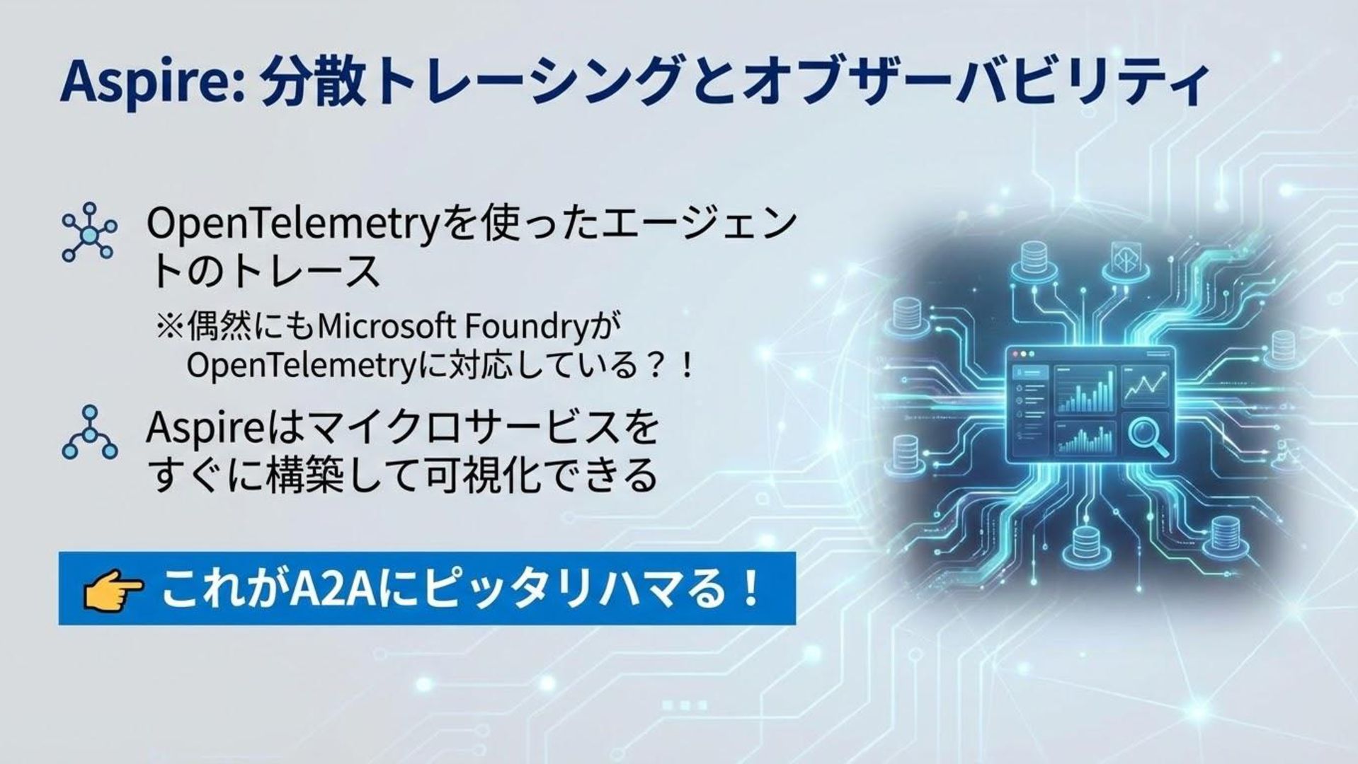 本資料では、AIエージェント間の連携を実現するA2Aプロトコルと、従来のMCPとの違いを説明します。A2Aはツール中心ではなく、ワークフロー中心の対話的なアプローチを提供し、大規模マルチエージェントシステムの課題に対応します。プロトコルの主な機能としてエージェントオーケストレーション、Discovery、JSON‑RPC over HTTP、タスク分解による専門性の分担、宣言的定義などがあります。また、Kubernetes と Azure の各 PaaS(App Service、Container Apps、Functions)を組み合わせることで、スケーラブルかつ観測可能なシステムを構築できることを示しています。.NET エコシステムは Aspire、Dapr、A2A SDK などを通じて必要な機能を備えており、マイクロサービスアーキテクチャ上で A2A を最大限活用できる環境が整っています。