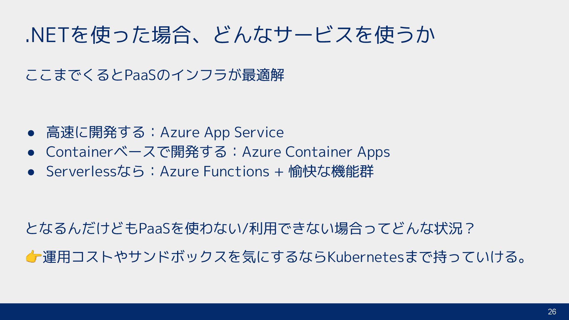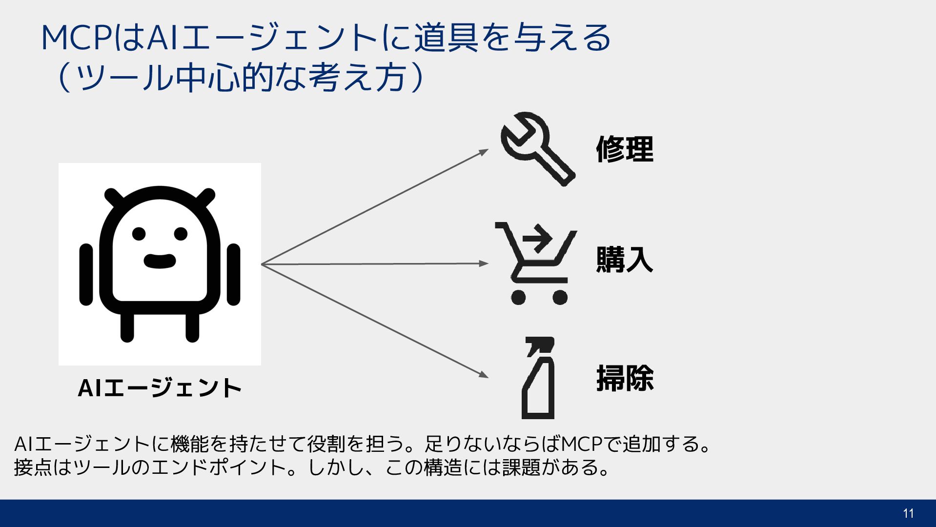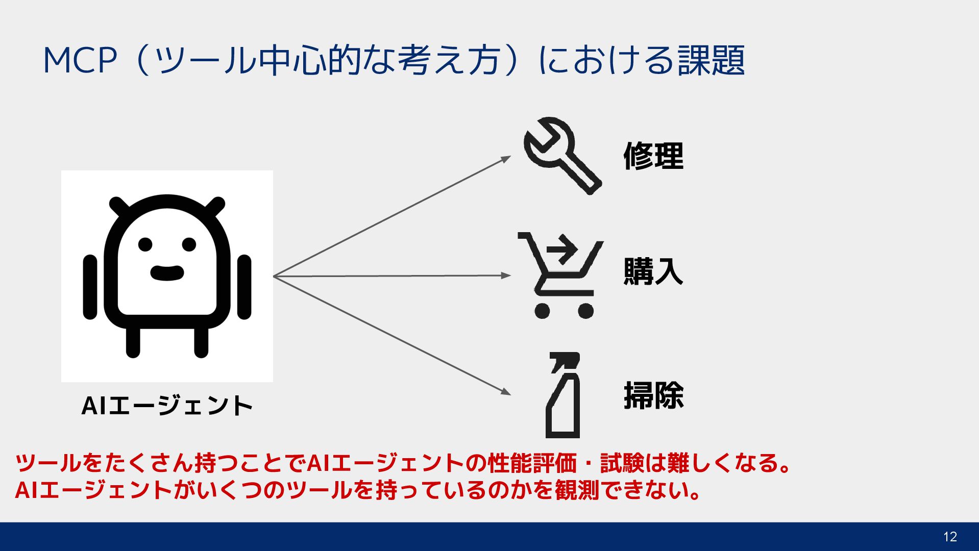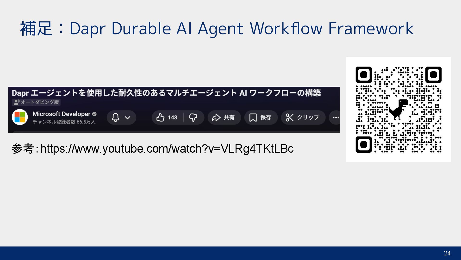 本資料では、AIエージェント間の連携を実現するA2Aプロトコルと、従来のMCPとの違いを説明します。A2Aはツール中心ではなく、ワークフロー中心の対話的なアプローチを提供し、大規模マルチエージェントシステムの課題に対応します。プロトコルの主な機能としてエージェントオーケストレーション、Discovery、JSON‑RPC over HTTP、タスク分解による専門性の分担、宣言的定義などがあります。また、Kubernetes と Azure の各 PaaS(App Service、Container Apps、Functions)を組み合わせることで、スケーラブルかつ観測可能なシステムを構築できることを示しています。.NET エコシステムは Aspire、Dapr、A2A SDK などを通じて必要な機能を備えており、マイクロサービスアーキテクチャ上で A2A を最大限活用できる環境が整っています。