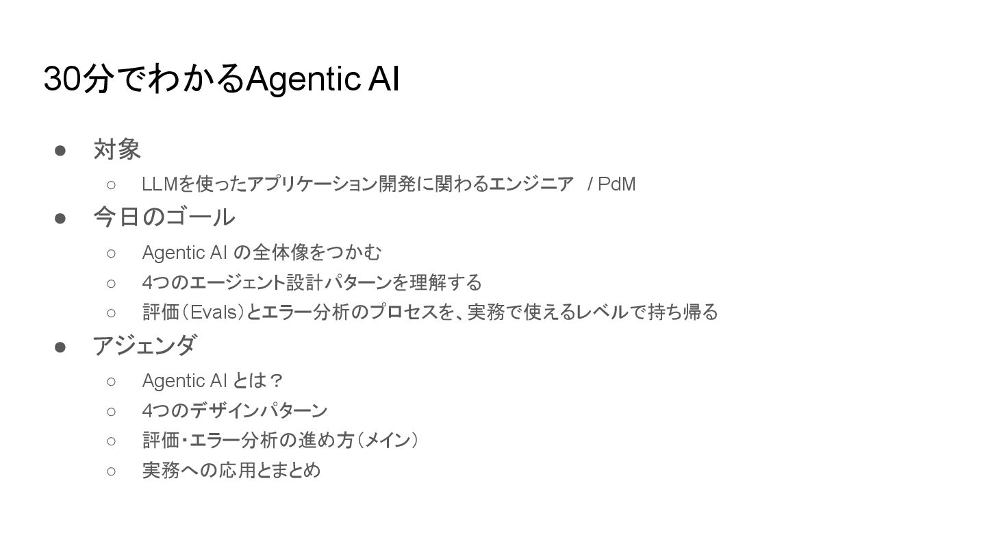 ◦ Agentic AI の全体像をつかむ ◦ 4つのエージェント設計パターンを理解する ◦ 評価(Evals)とエラー分析のプロセスを、実務で使えるレベルで持ち帰る • アジェンダ ◦ Agentic AI とは? ◦ 4つのデザインパターン ◦ 評価・エラー分析の進め方(メイン) ◦ 実務への応用とまとめ