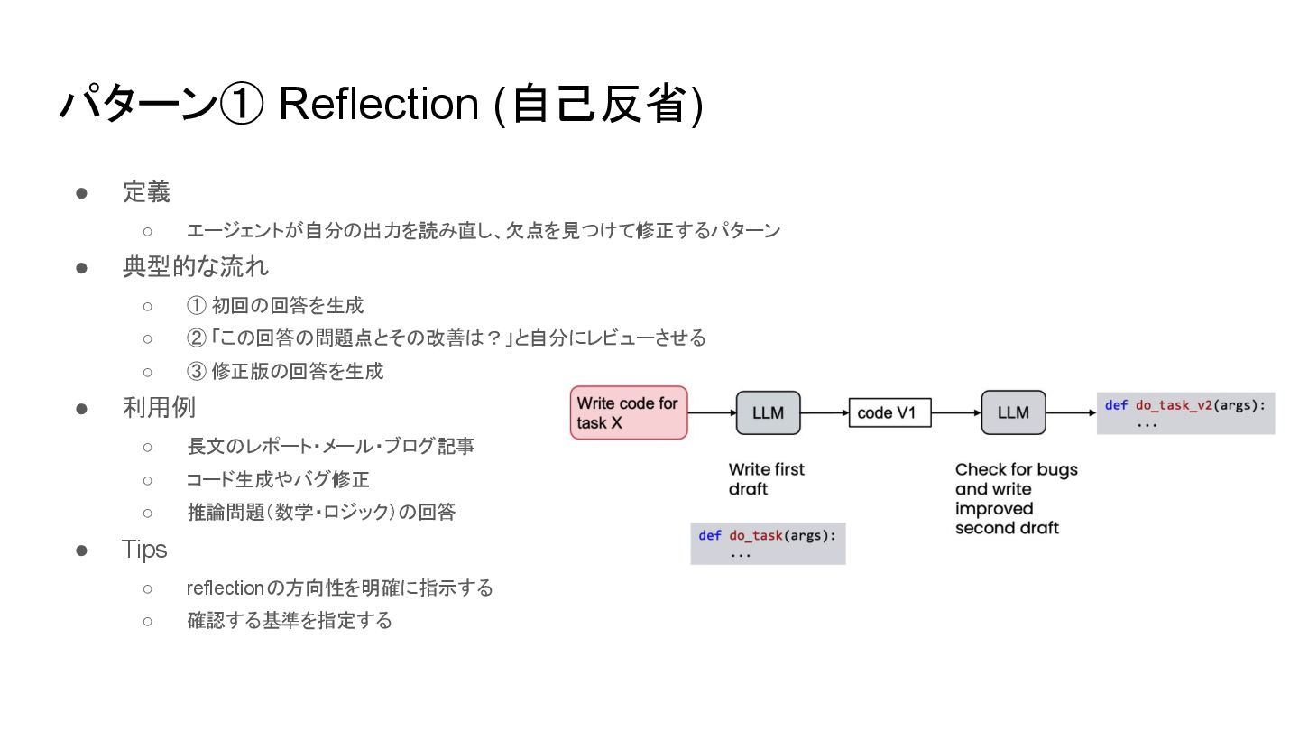 ① 初回の回答を生成 ◦ ② 「この回答の問題点とその改善は?」と自分にレビューさせる ◦ ③ 修正版の回答を生成 • 利用例 ◦ 長文のレポート・メール・ブログ記事 ◦ コード生成やバグ修正 ◦ 推論問題(数学・ロジック)の回答 • Tips ◦ reflectionの方向性を明確に指示する ◦ 確認する基準を指定する