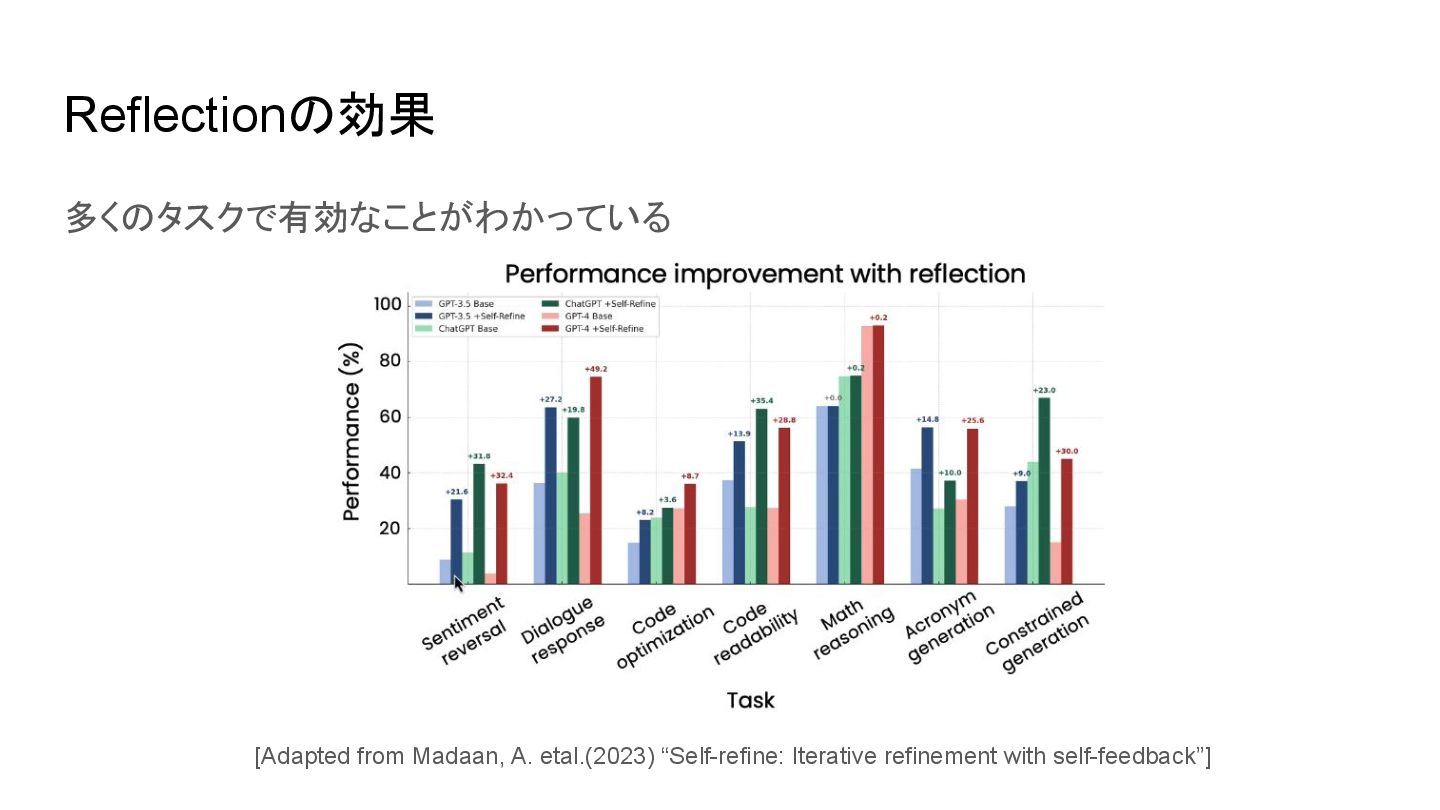 Reflectionの効果 多くのタスクで有効なことがわかっている [Adapted from Madaan, A. etal.(2023) “Self-refine: Iterative refinement