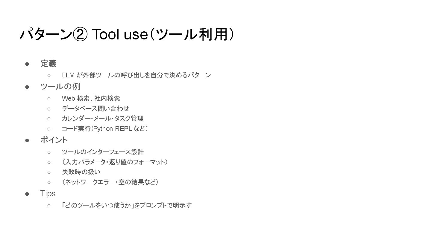 パターン② Tool use(ツール利用) • 定義 ◦ LLM が外部ツールの呼び出しを自分で決めるパターン • ツールの例