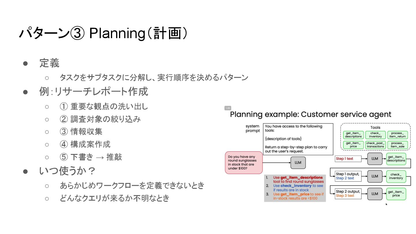 パターン③ Planning(計画) • 定義 ◦ タスクをサブタスクに分解し、実行順序を決めるパターン • 例:リサーチレポート作成 ◦ ①
