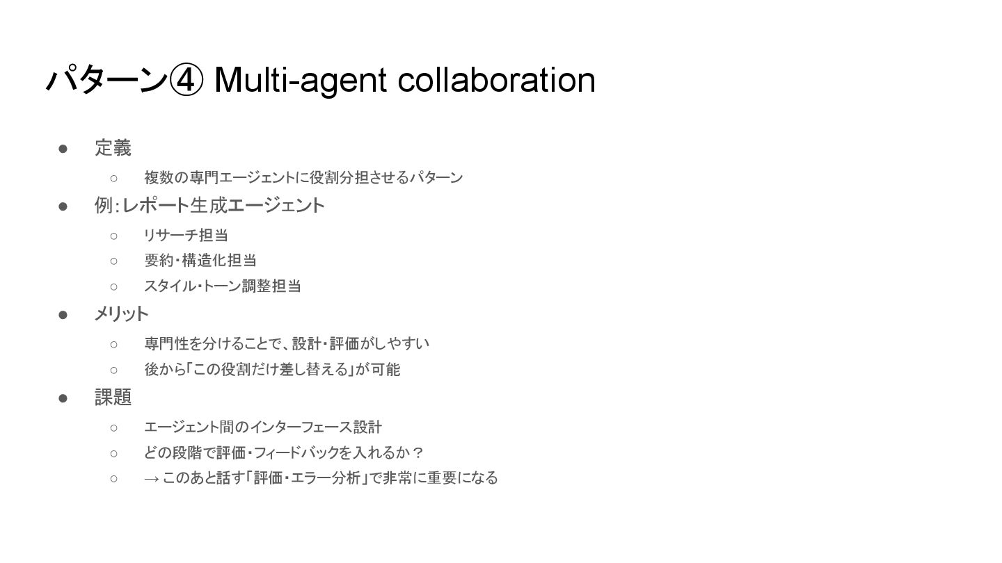 リサーチ担当 ◦ 要約・構造化担当 ◦ スタイル・トーン調整担当 • メリット ◦ 専門性を分けることで、設計・評価がしやすい ◦ 後から「この役割だけ差し替える」が可能 • 課題 ◦ エージェント間のインターフェース設計 ◦ どの段階で評価・フィードバックを入れるか? ◦ → このあと話す「評価・エラー分析」で非常に重要になる
