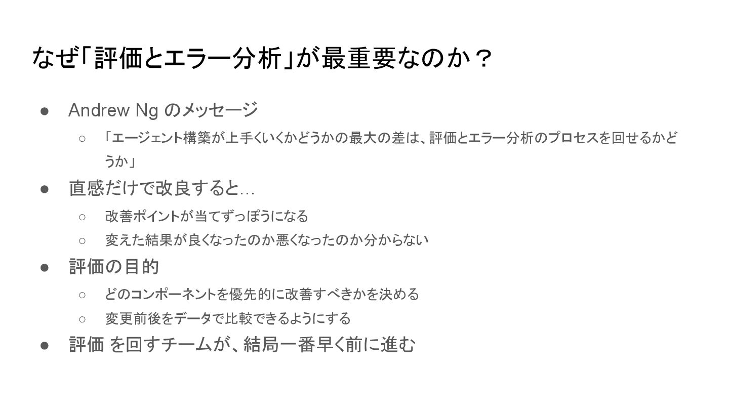 なぜ「評価とエラー分析」が最重要なのか? • Andrew Ng のメッセージ ◦ 「エージェント構築が上手くいくかどうかの最大の差は、評価とエラー分析のプロセスを回せるかど うか」 • 直感だけで改良すると…