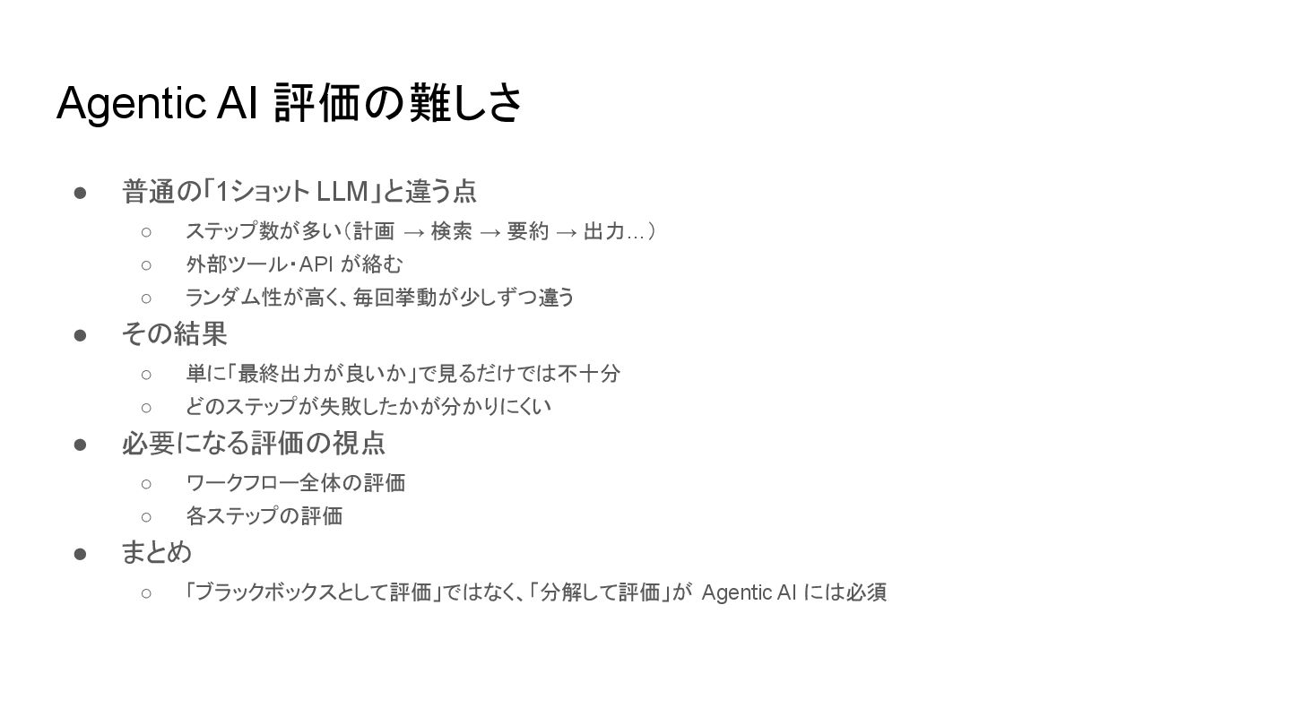→ 要約 → 出力…) ◦ 外部ツール・API が絡む ◦ ランダム性が高く、毎回挙動が少しずつ違う • その結果 ◦ 単に「最終出力が良いか」で見るだけでは不十分 ◦ どのステップが失敗したかが分かりにくい • 必要になる評価の視点 ◦ ワークフロー全体の評価 ◦ 各ステップの評価 • まとめ ◦ 「ブラックボックスとして評価」ではなく、「分解して評価」が Agentic AI には必須