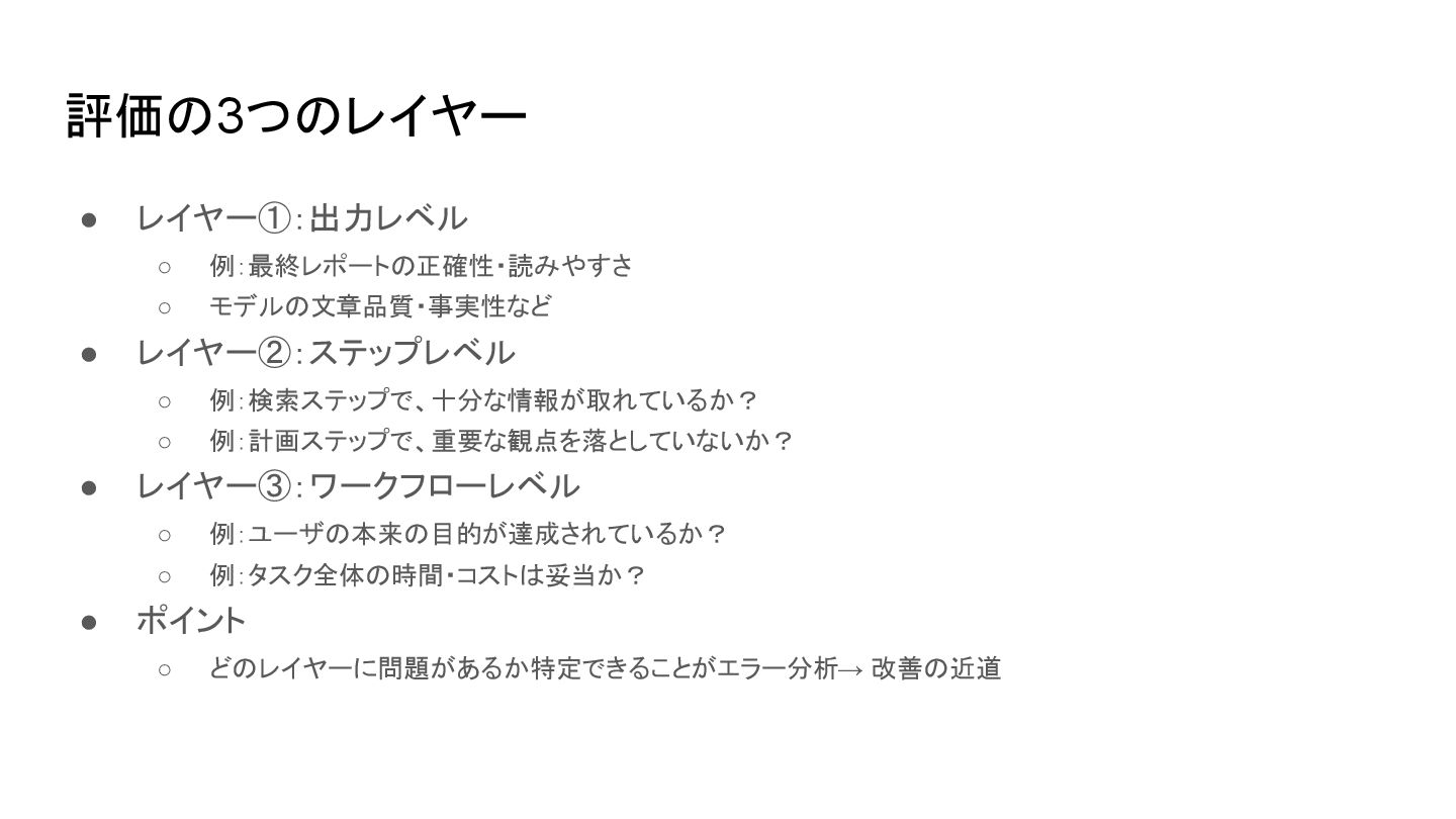 評価の3つのレイヤー • レイヤー①:出力レベル ◦ 例:最終レポートの正確性・読みやすさ ◦ モデルの文章品質・事実性など • レイヤー②:ステップレベル ◦