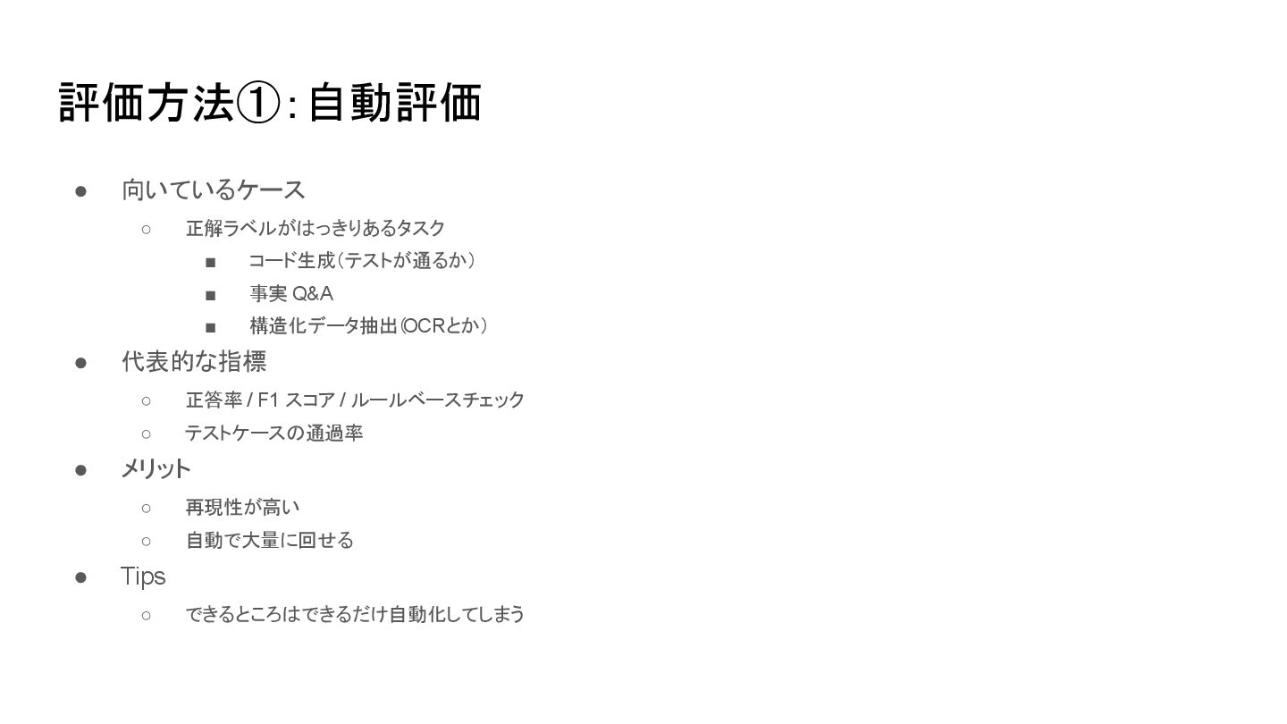 ▪ 構造化データ抽出( OCRとか) • 代表的な指標 ◦ 正答率 / F1 スコア / ルールベースチェック ◦ テストケースの通過率 • メリット ◦ 再現性が高い ◦ 自動で大量に回せる • Tips ◦ できるところはできるだけ自動化してしまう