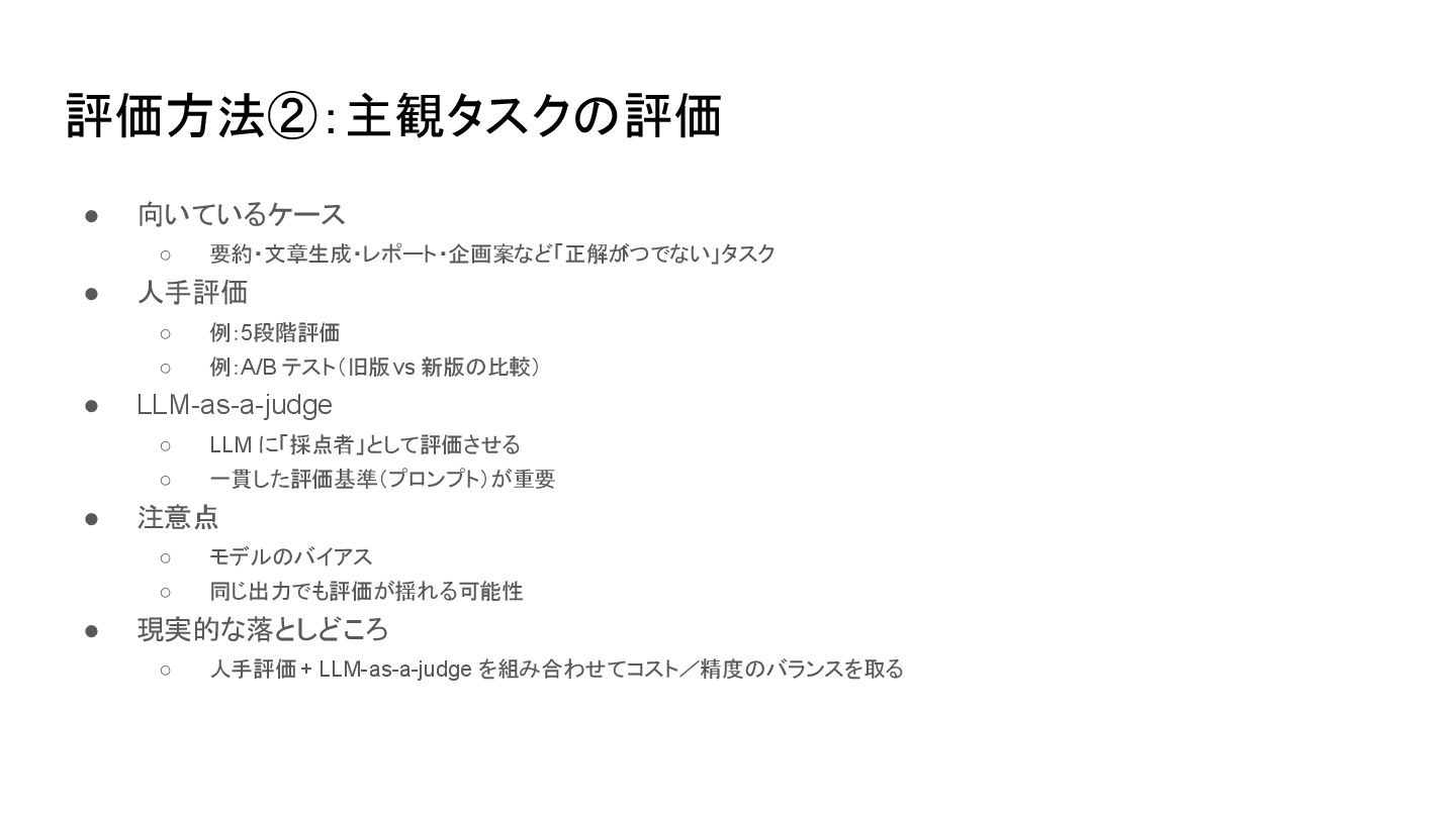 ◦ 例:A/B テスト(旧版 vs 新版の比較) • LLM-as-a-judge ◦ LLM に「採点者」として評価させる ◦ 一貫した評価基準(プロンプト)が重要 • 注意点 ◦ モデルのバイアス ◦ 同じ出力でも評価が揺れる可能性 • 現実的な落としどころ ◦ 人手評価 + LLM-as-a-judge を組み合わせてコスト/精度のバランスを取る