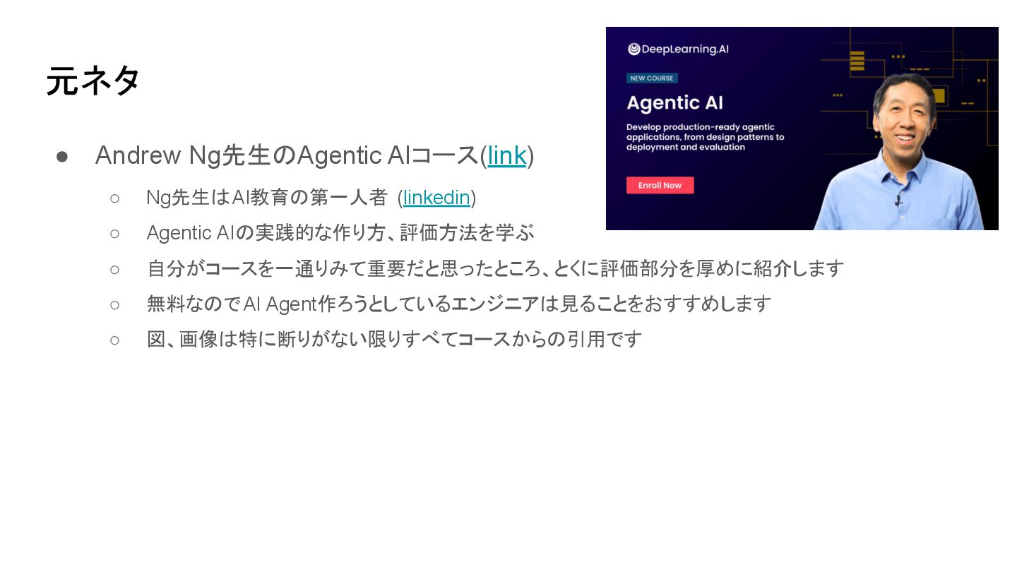 元ネタ • Andrew Ng先生のAgentic AIコース(link) ◦ Ng先生はAI教育の第一人者 (linkedin) ◦ Agentic
