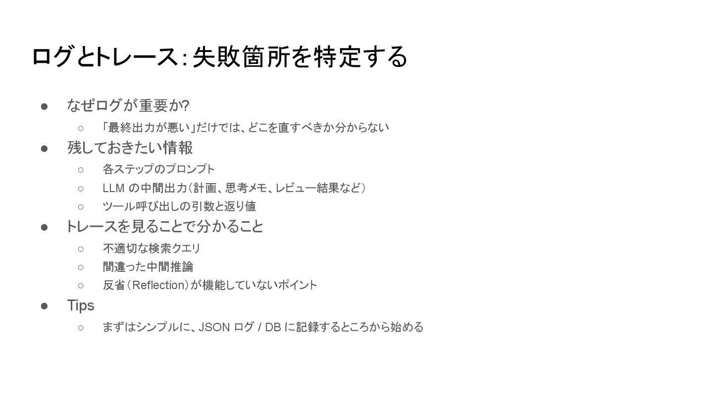 LLM の中間出力(計画、思考メモ、レビュー結果など) ◦ ツール呼び出しの引数と返り値 • トレースを見ることで分かること ◦ 不適切な検索クエリ ◦ 間違った中間推論 ◦ 反省(Reflection)が機能していないポイント • Tips ◦ まずはシンプルに、JSON ログ / DB に記録するところから始める