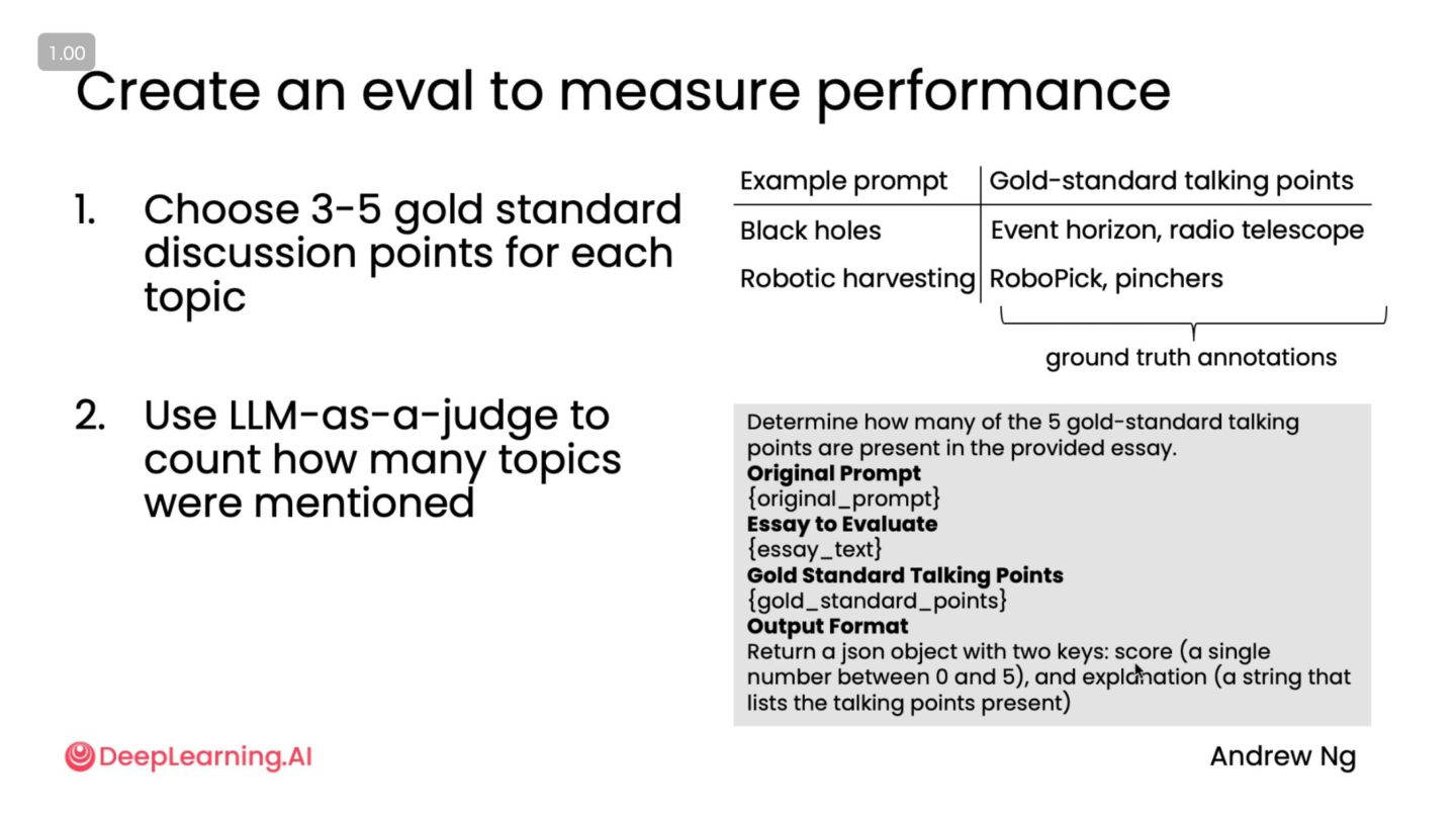 AIの実践的な作り方、評価方法を学ぶ ◦ 自分がコースを一通りみて重要だと思ったところ、とくに評価部分を厚めに紹介します ◦ 無料なのでAI Agent作ろうとしているエンジニアは見ることをおすすめします ◦ 図、画像は特に断りがない限りすべてコースからの引用です