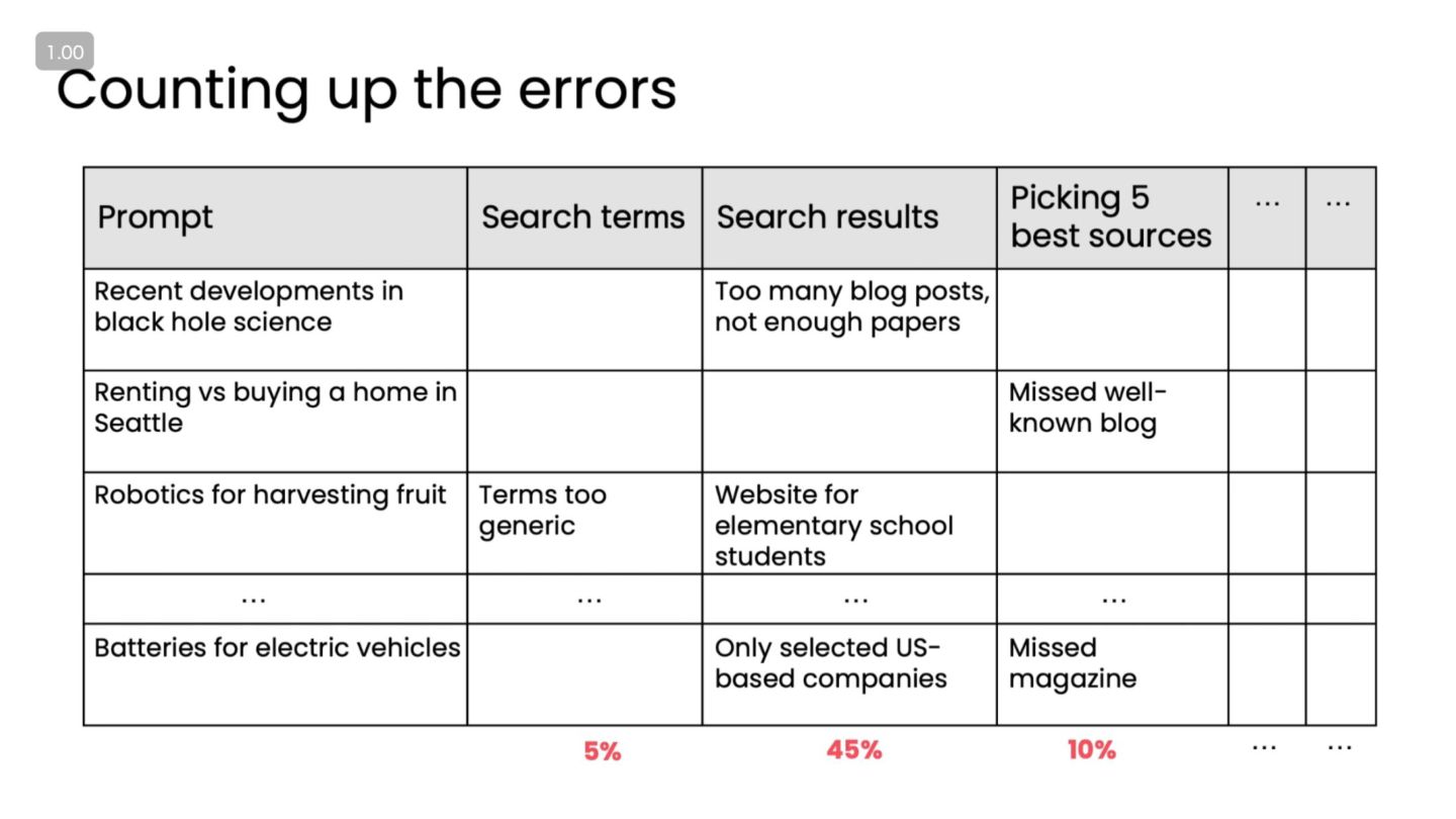 エラー分析①:エラーの分類 • エラー例 ◦ リサーチ不足(重要な情報を取りこぼしている) ◦ 要約の誤り・幻覚(存在しない事実) ◦ スタイル不一致(トーン・フォーマットが要件と違う) ◦