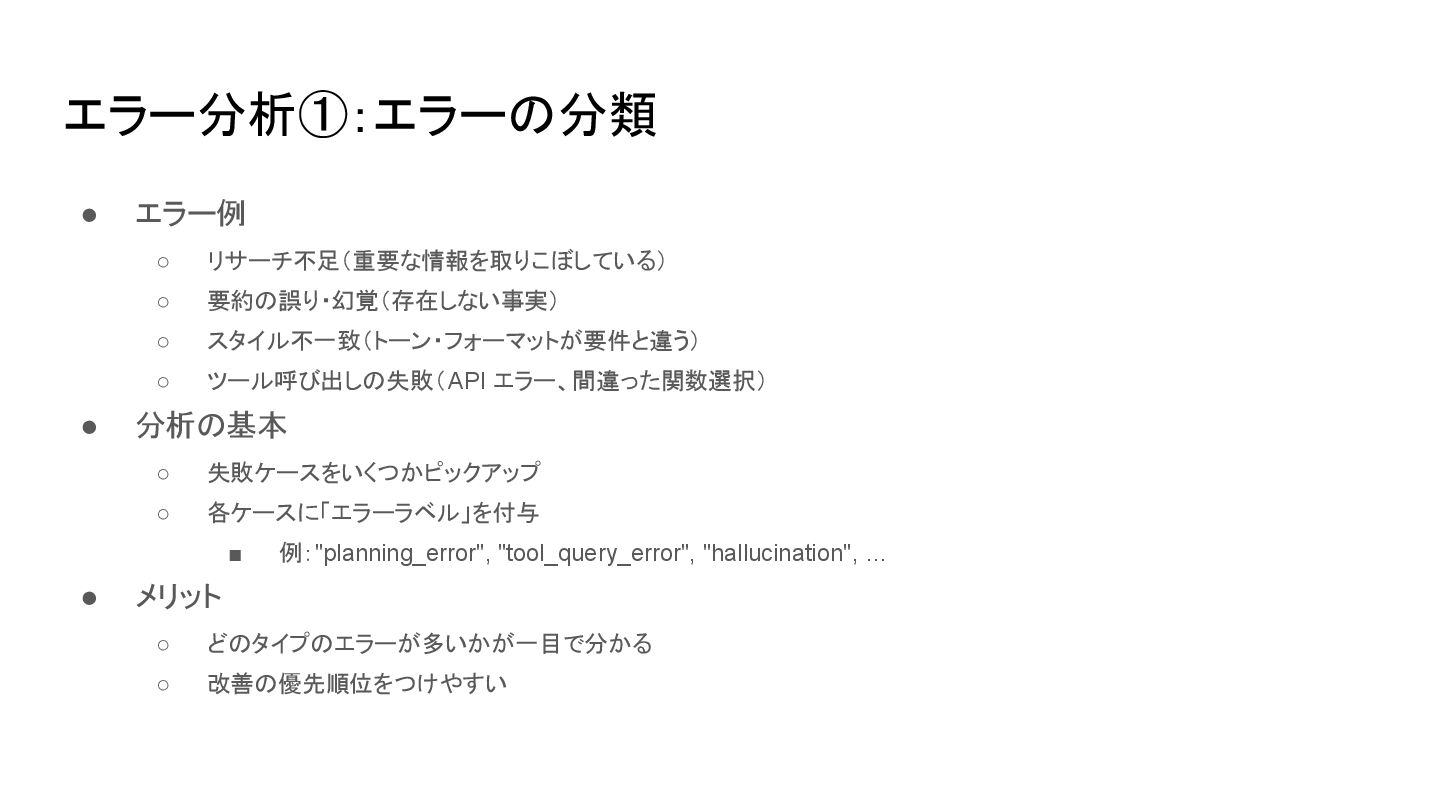ツール呼び出しの失敗(API エラー、間違った関数選択) • 分析の基本 ◦ 失敗ケースをいくつかピックアップ ◦ 各ケースに「エラーラベル」を付与 ▪ 例:"planning_error", "tool_query_error", "hallucination", … • メリット ◦ どのタイプのエラーが多いかが一目で分かる ◦ 改善の優先順位をつけやすい