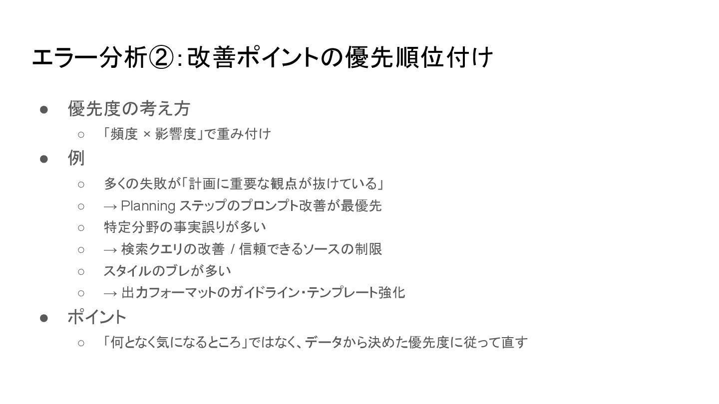 多くの失敗が「計画に重要な観点が抜けている」 ◦ → Planning ステップのプロンプト改善が最優先 ◦ 特定分野の事実誤りが多い ◦ → 検索クエリの改善 / 信頼できるソースの制限 ◦ スタイルのブレが多い ◦ → 出力フォーマットのガイドライン・テンプレート強化 • ポイント ◦ 「何となく気になるところ」ではなく、データから決めた優先度に従って直す