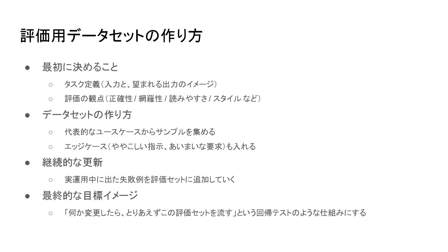 読みやすさ / スタイル など) • データセットの作り方 ◦ 代表的なユースケースからサンプルを集める ◦ エッジケース(ややこしい指示、あいまいな要求)も入れる • 継続的な更新 ◦ 実運用中に出た失敗例を評価セットに追加していく • 最終的な目標イメージ ◦ 「何か変更したら、とりあえずこの評価セットを流す」という回帰テストのような仕組みにする