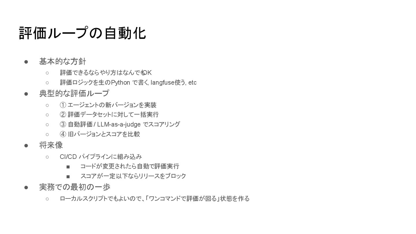 langfuse使う, etc • 典型的な評価ループ ◦ ① エージェントの新バージョンを実装 ◦ ② 評価データセットに対して一括実行 ◦ ③ 自動評価 / LLM-as-a-judge でスコアリング ◦ ④ 旧バージョンとスコアを比較 • 将来像 ◦ CI/CD パイプラインに組み込み ▪ コードが変更されたら自動で 評価実行 ▪ スコアが一定以下ならリリースをブロック • 実務での最初の一歩 ◦ ローカルスクリプトでもよいので、「ワンコマンドで評価が回る」状態を作る