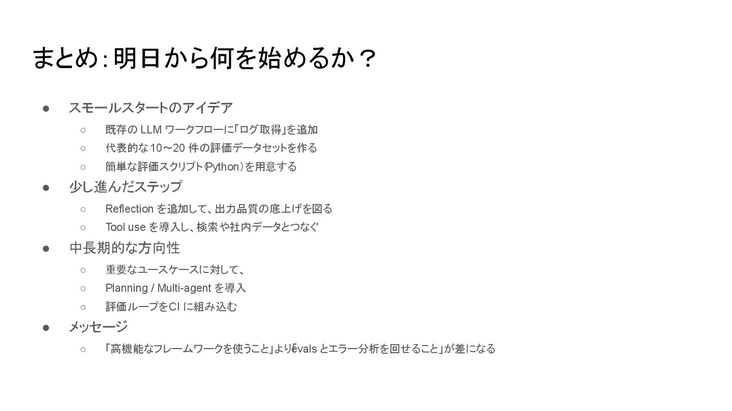 件の評価データセットを作る ◦ 簡単な評価スクリプト( Python)を用意する • 少し進んだステップ ◦ Reflection を追加して、出力品質の底上げを図る ◦ Tool use を導入し、検索や社内データとつなぐ • 中長期的な方向性 ◦ 重要なユースケースに対して、 ◦ Planning / Multi-agent を導入 ◦ 評価ループを CI に組み込む • メッセージ ◦ 「高機能なフレームワークを使うこと」より「 evals とエラー分析を回せること」が差になる