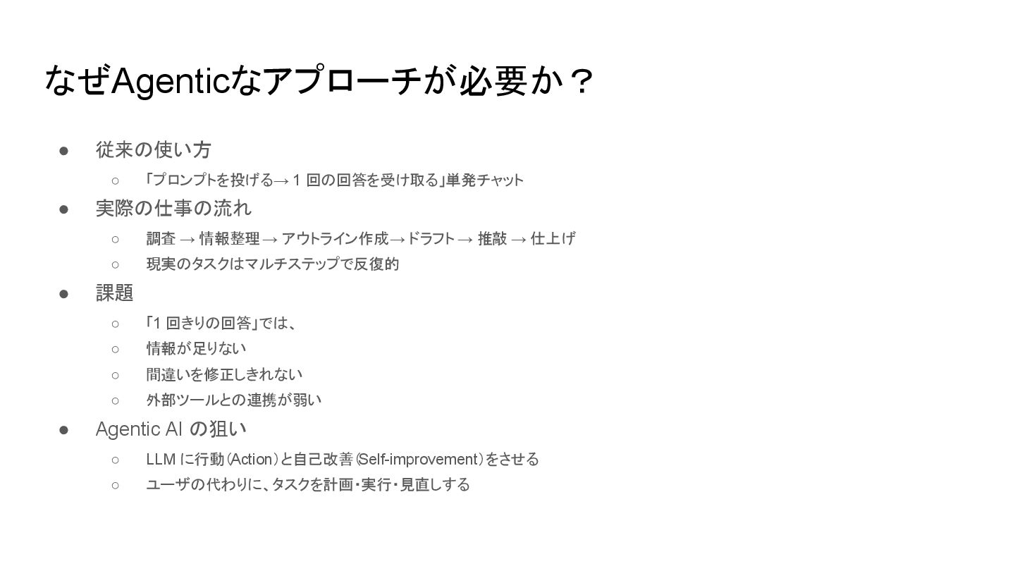 ◦ 調査 → 情報整理 → アウトライン作成 → ドラフト → 推敲 → 仕上げ ◦ 現実のタスクはマルチステップで反復的 • 課題 ◦ 「1 回きりの回答」では、 ◦ 情報が足りない ◦ 間違いを修正しきれない ◦ 外部ツールとの連携が弱い • Agentic AI の狙い ◦ LLM に行動(Action)と自己改善(Self-improvement)をさせる ◦ ユーザの代わりに、タスクを計画・実行・見直しする