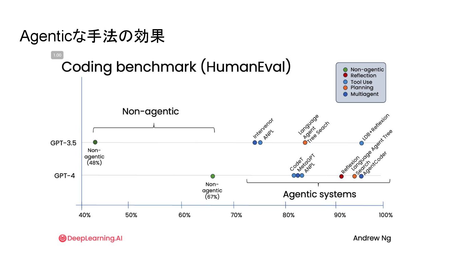 Agentic AI Non-agentic workflow (zero-shot): トピックXについてバックスペースは使わずに頭か ら一気に書いてください Agentic workflow •
