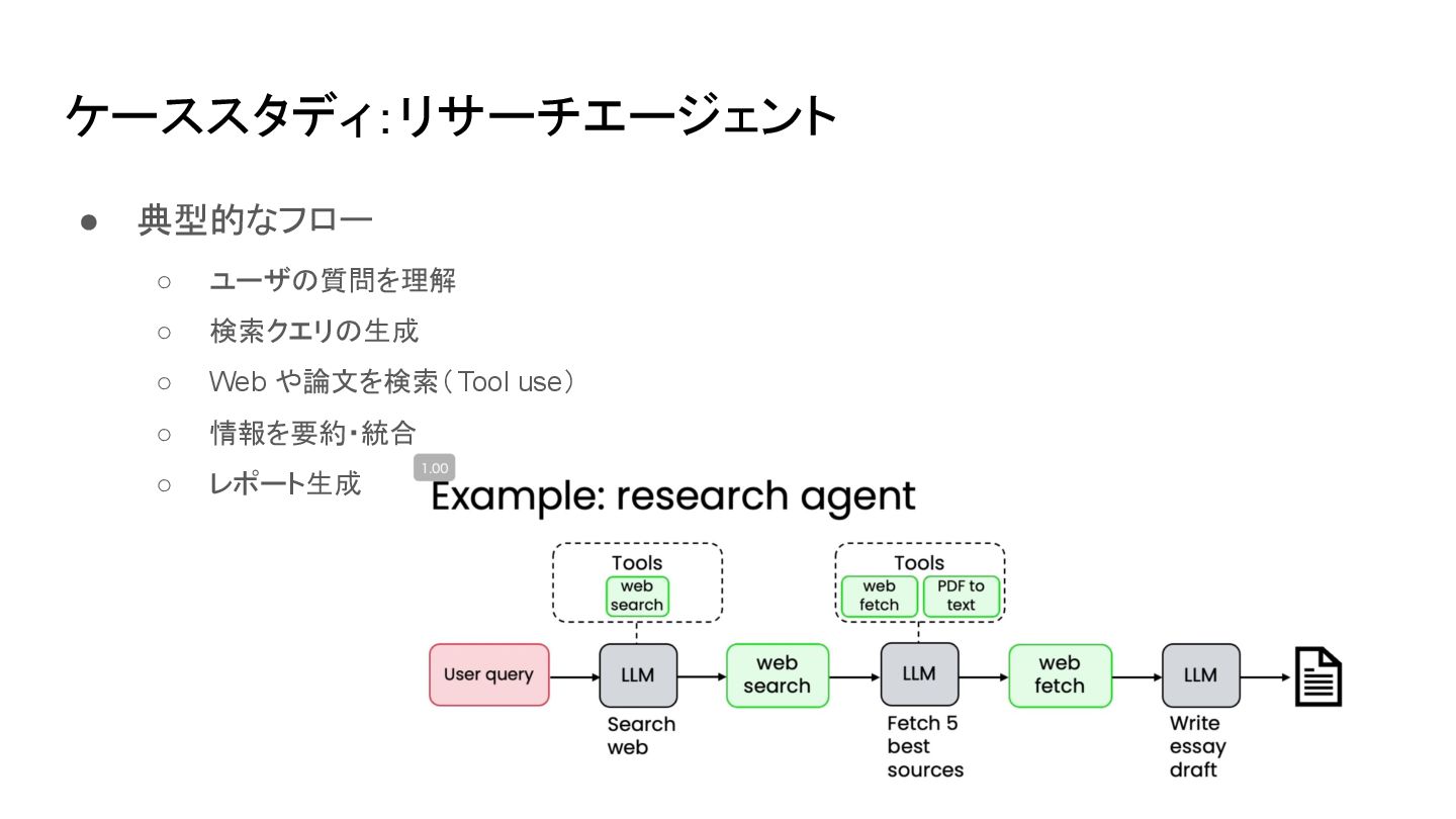 ケーススタディ:リサーチエージェント • 典型的なフロー ◦ ユーザの質問を理解 ◦ 検索クエリの生成 ◦ Web や論文を検索(Tool